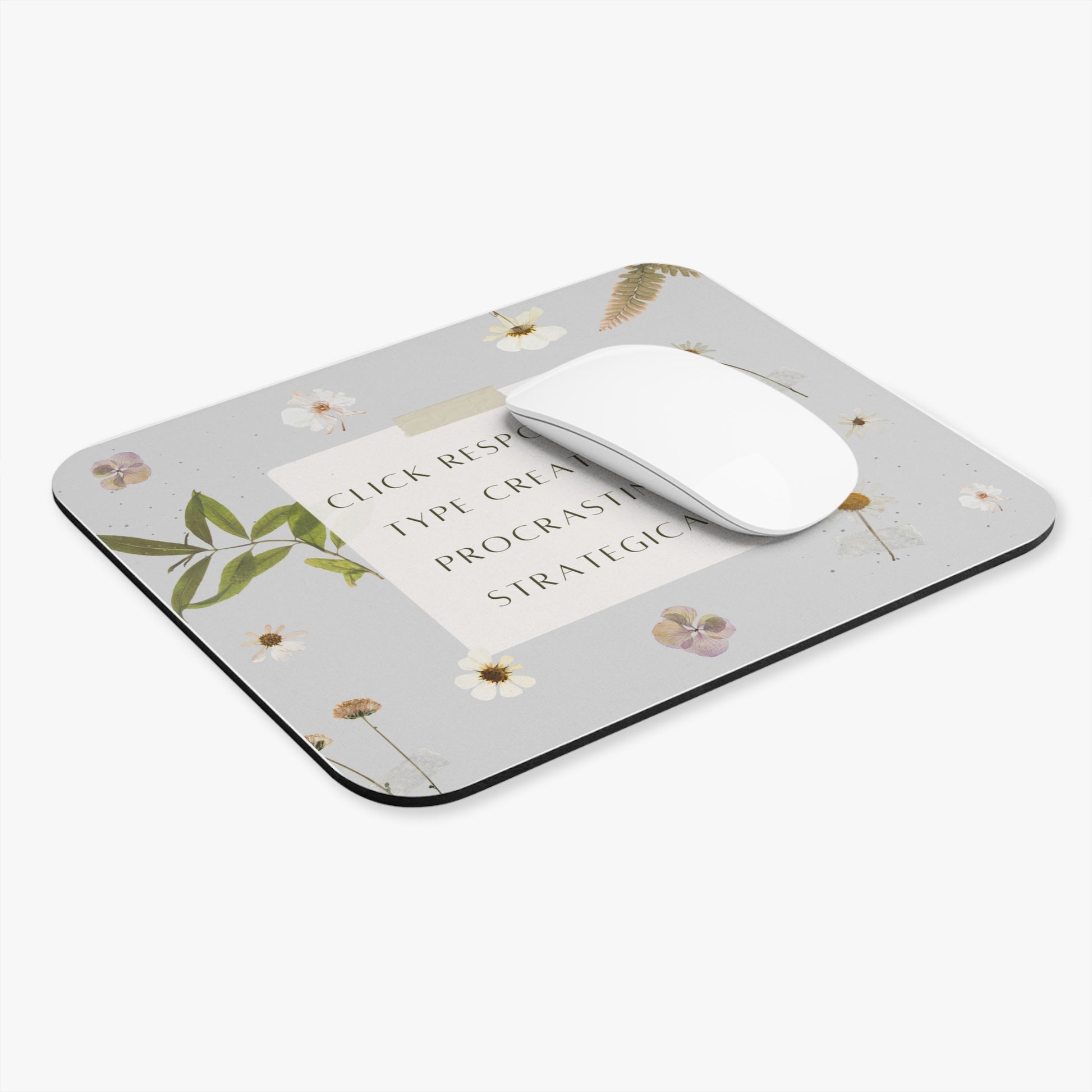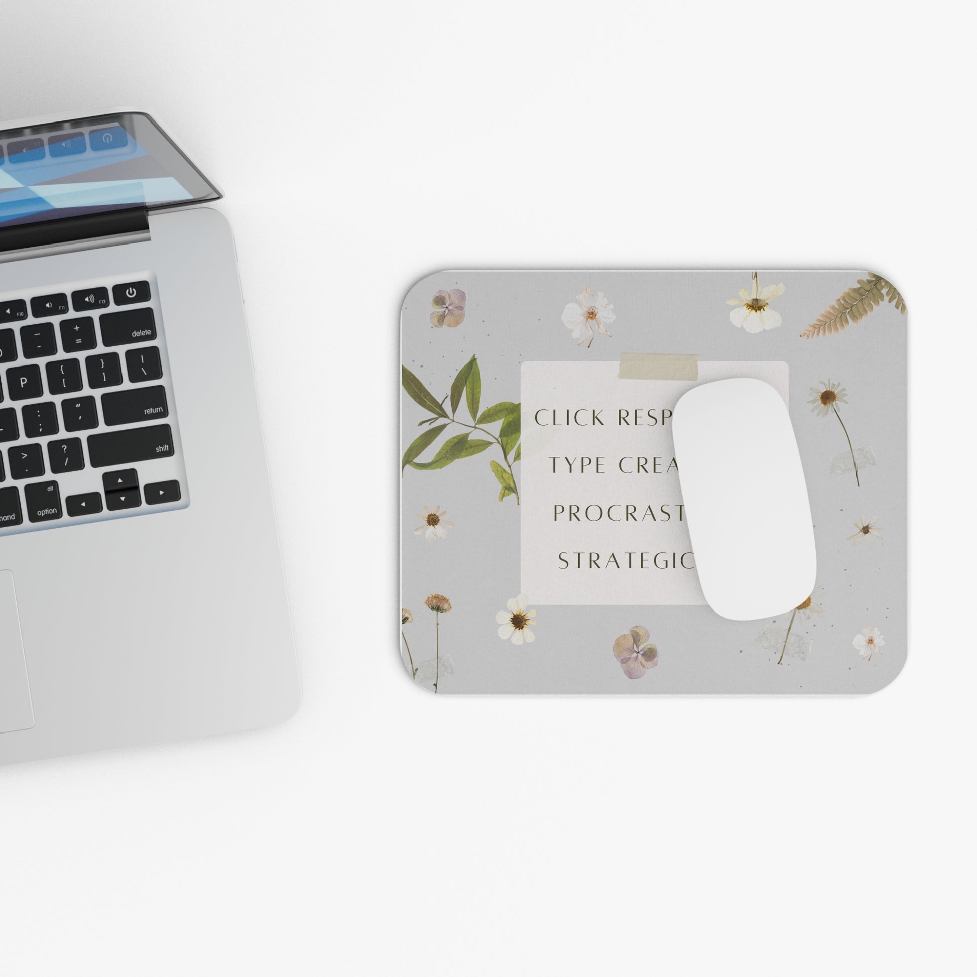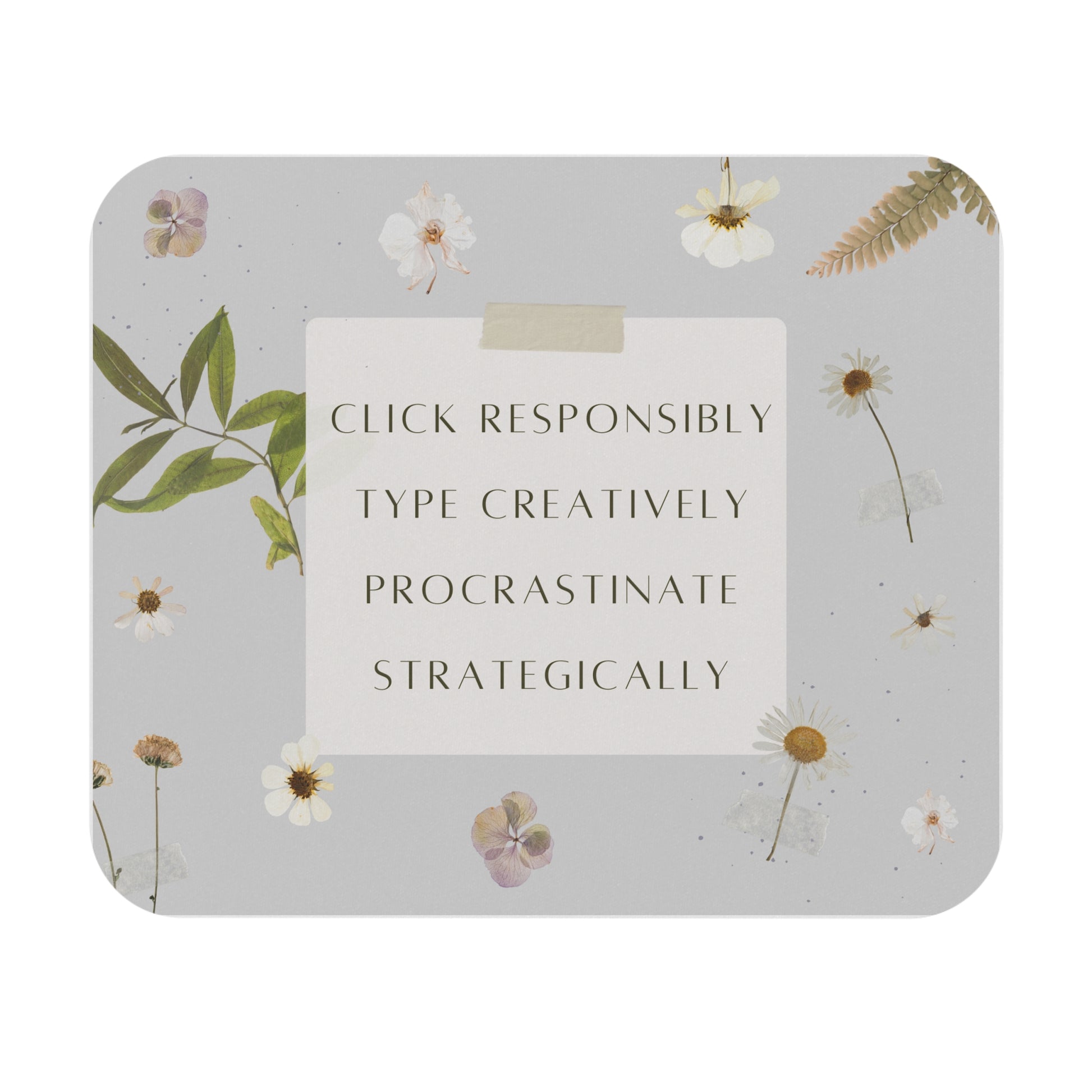 Click Responsibly, Type Creatively, Procrastinate Strategically' Mousepad – the ultimate workspace companion for the modern multitasker with a non-slip base and stain-resistant cloth top.