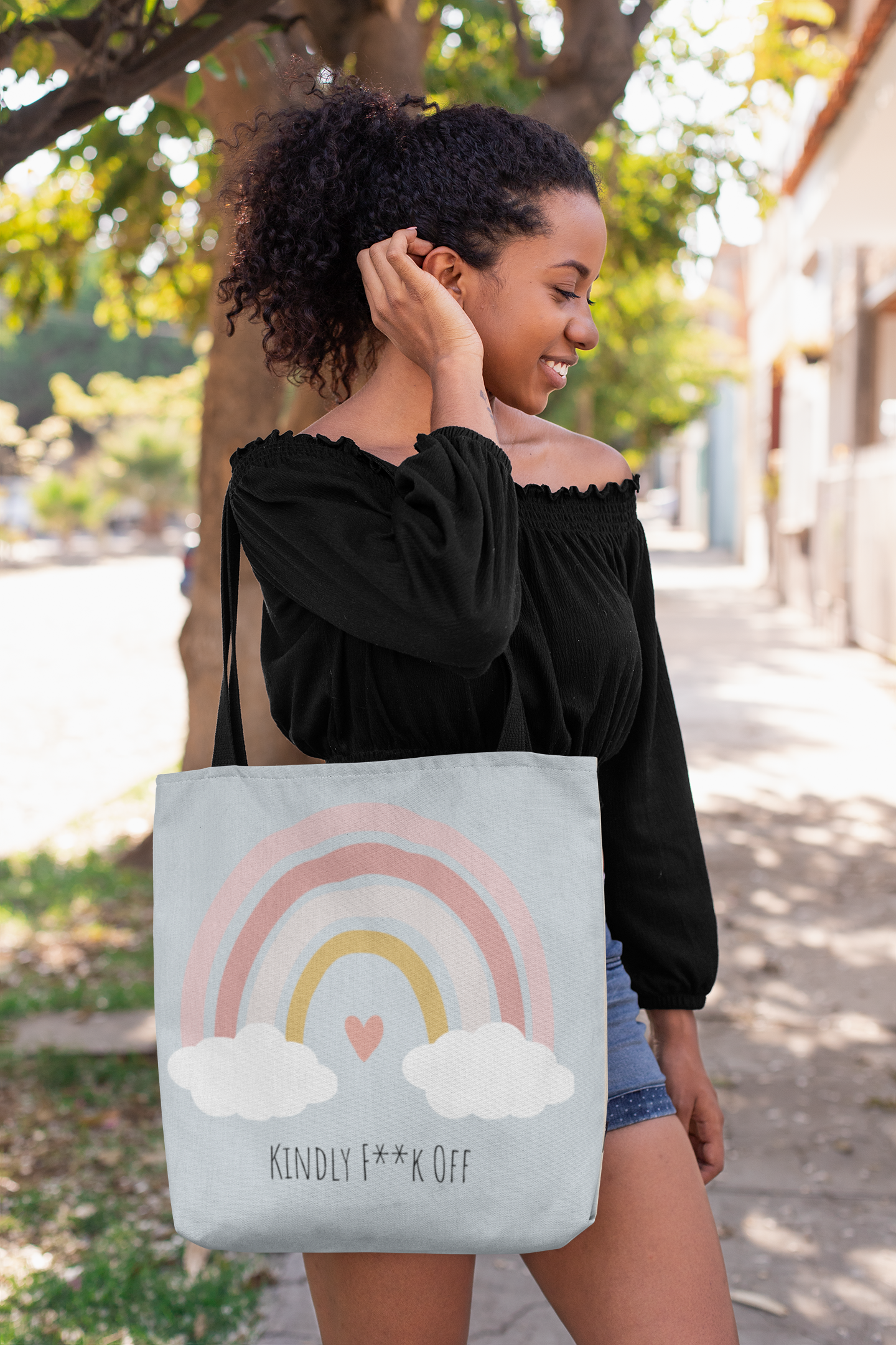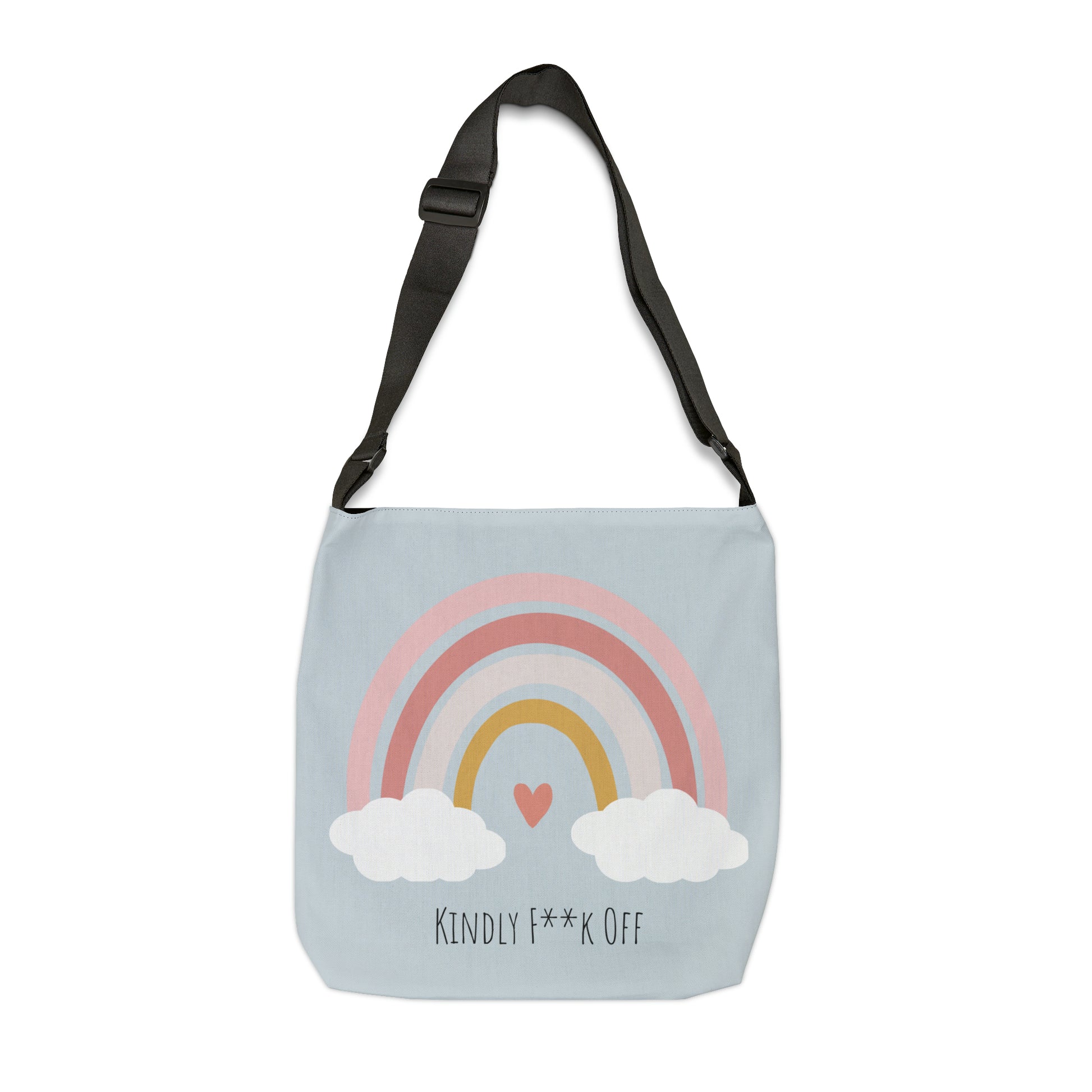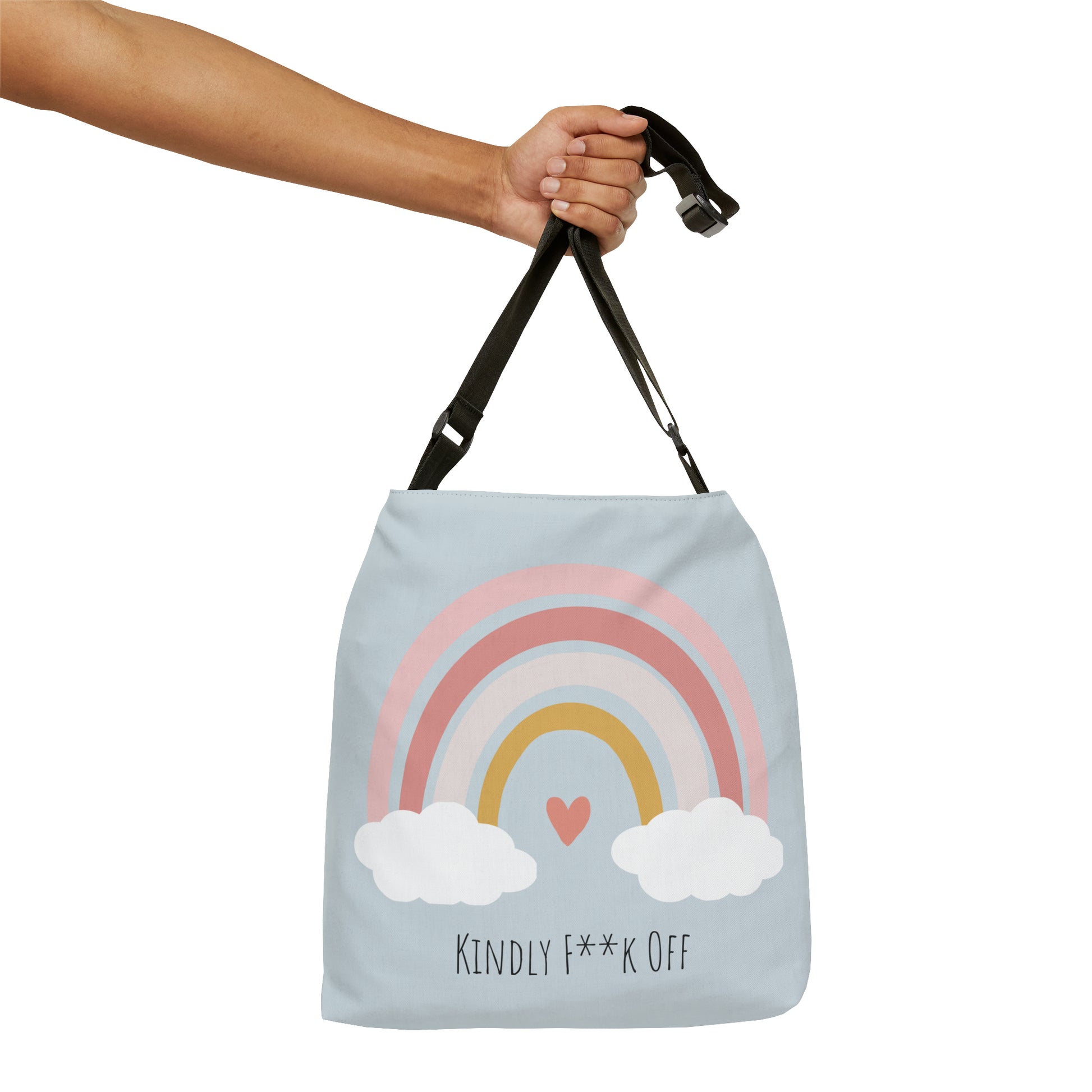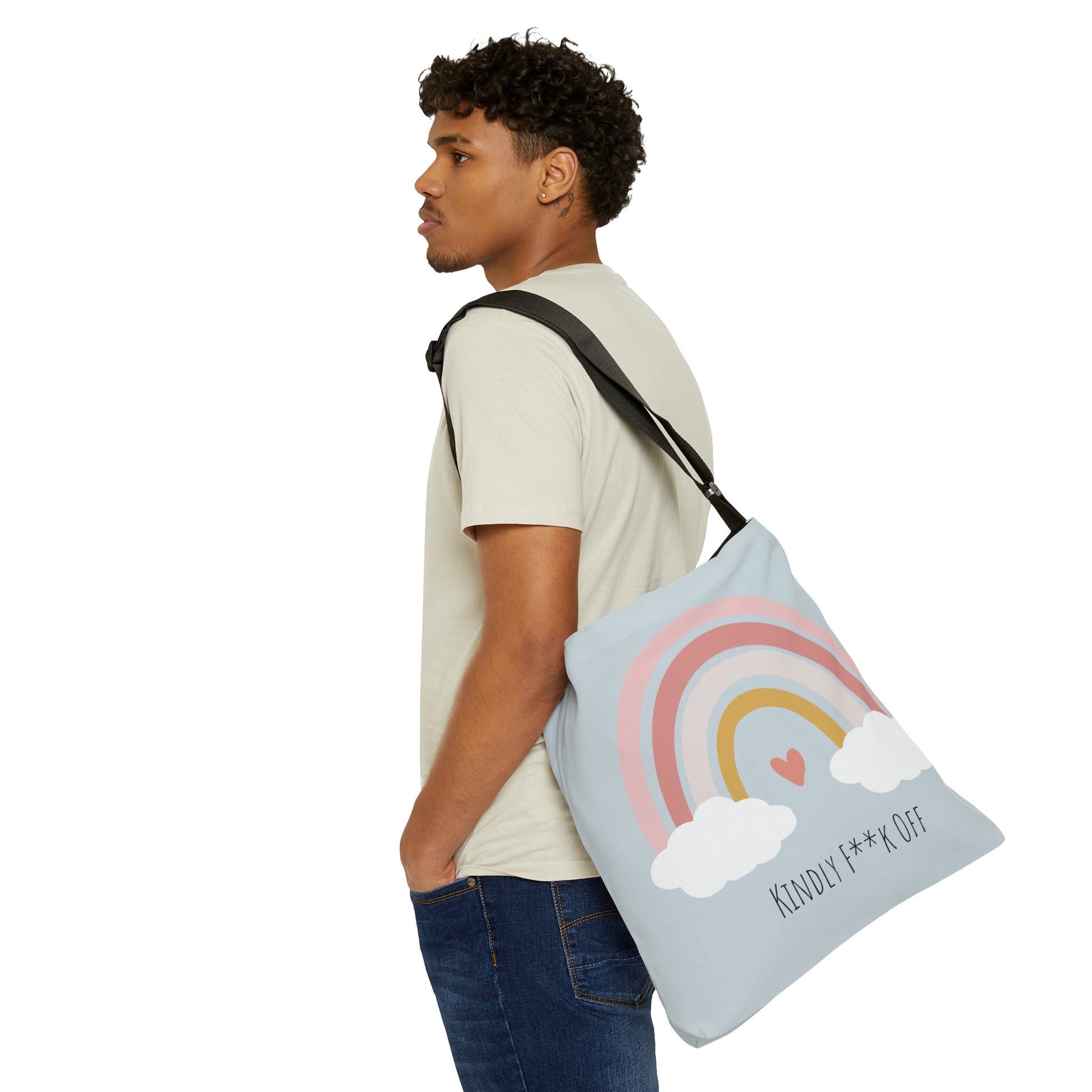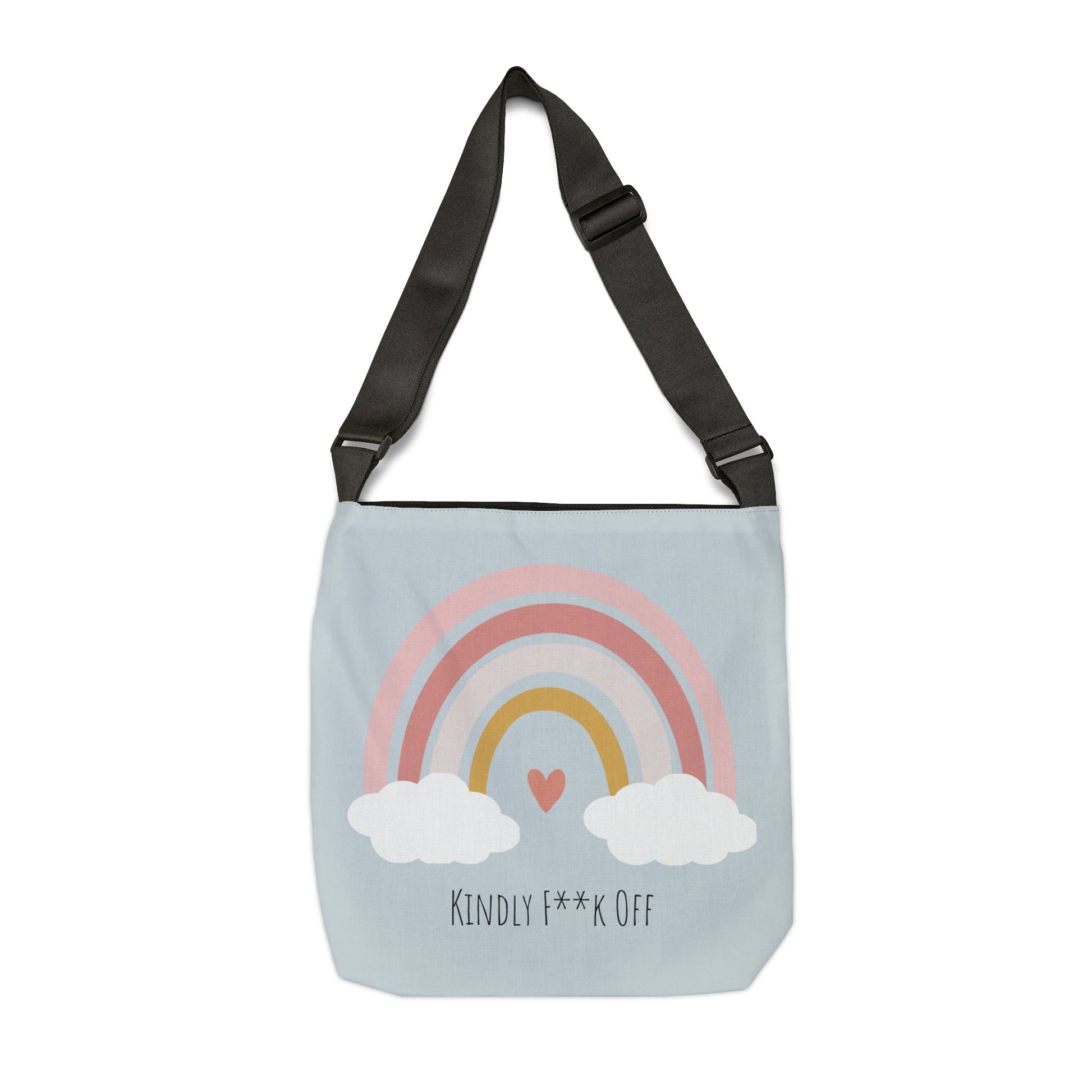The F**k Off Rainbow Adjustable Tote, a bold and vibrant accessory that combines a playful attitude with colorful style. This eye-catching tote features a captivating rainbow design along with the assertive phrase "Kindly F**k Off," making it a perfect statement piece for those who embrace their individuality and aren't afraid to express their boundaries.