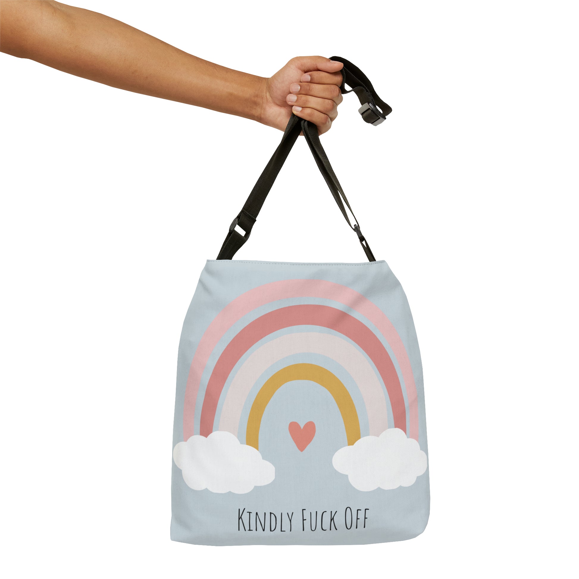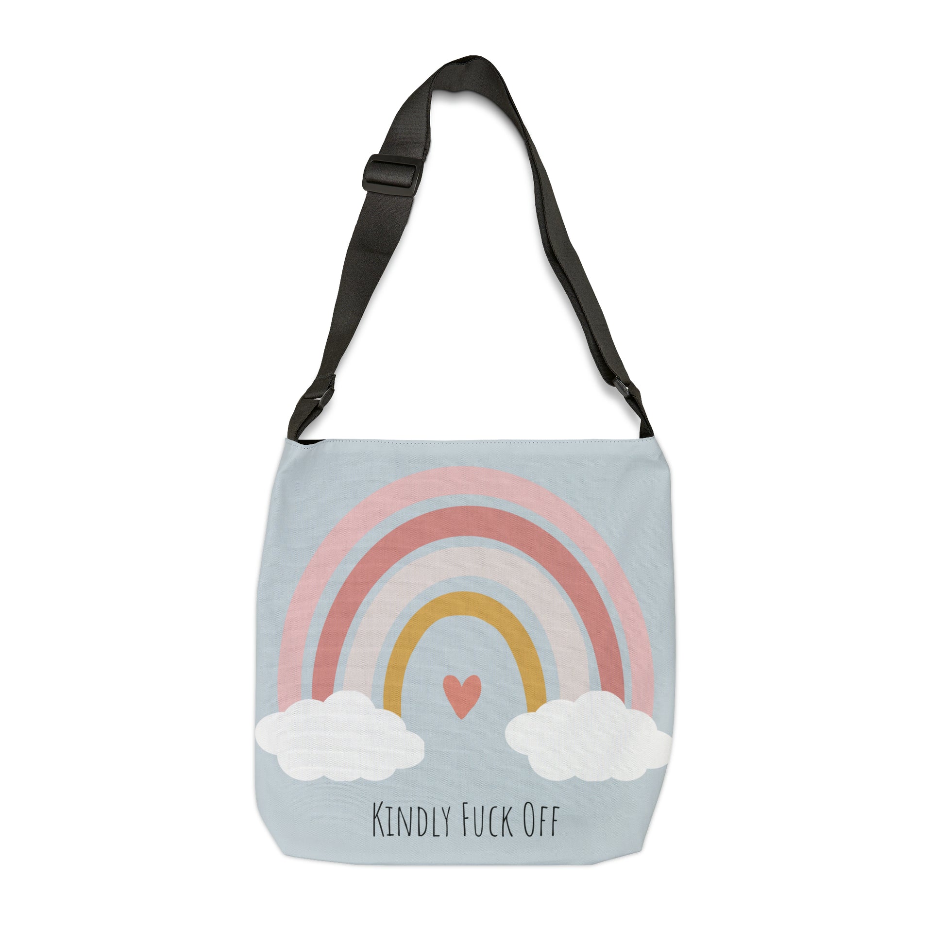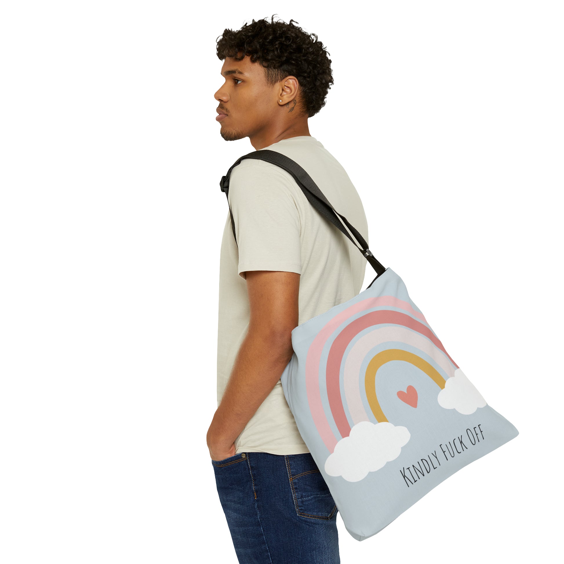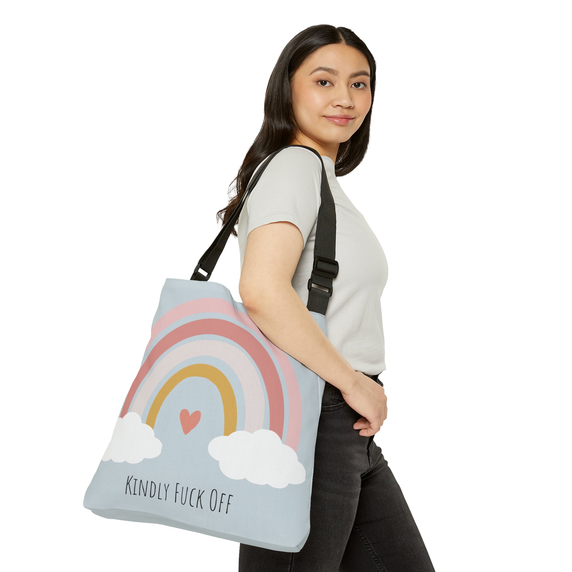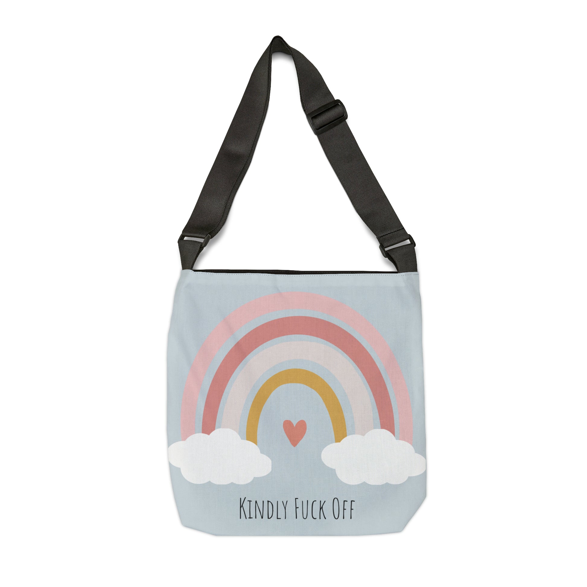 Our Kindly Fuck Off Rainbow Adjustable Tote serves as a fashion-forward accessory. Embrace your uniqueness and let your tote do the talking, as you make a statement wherever you go.