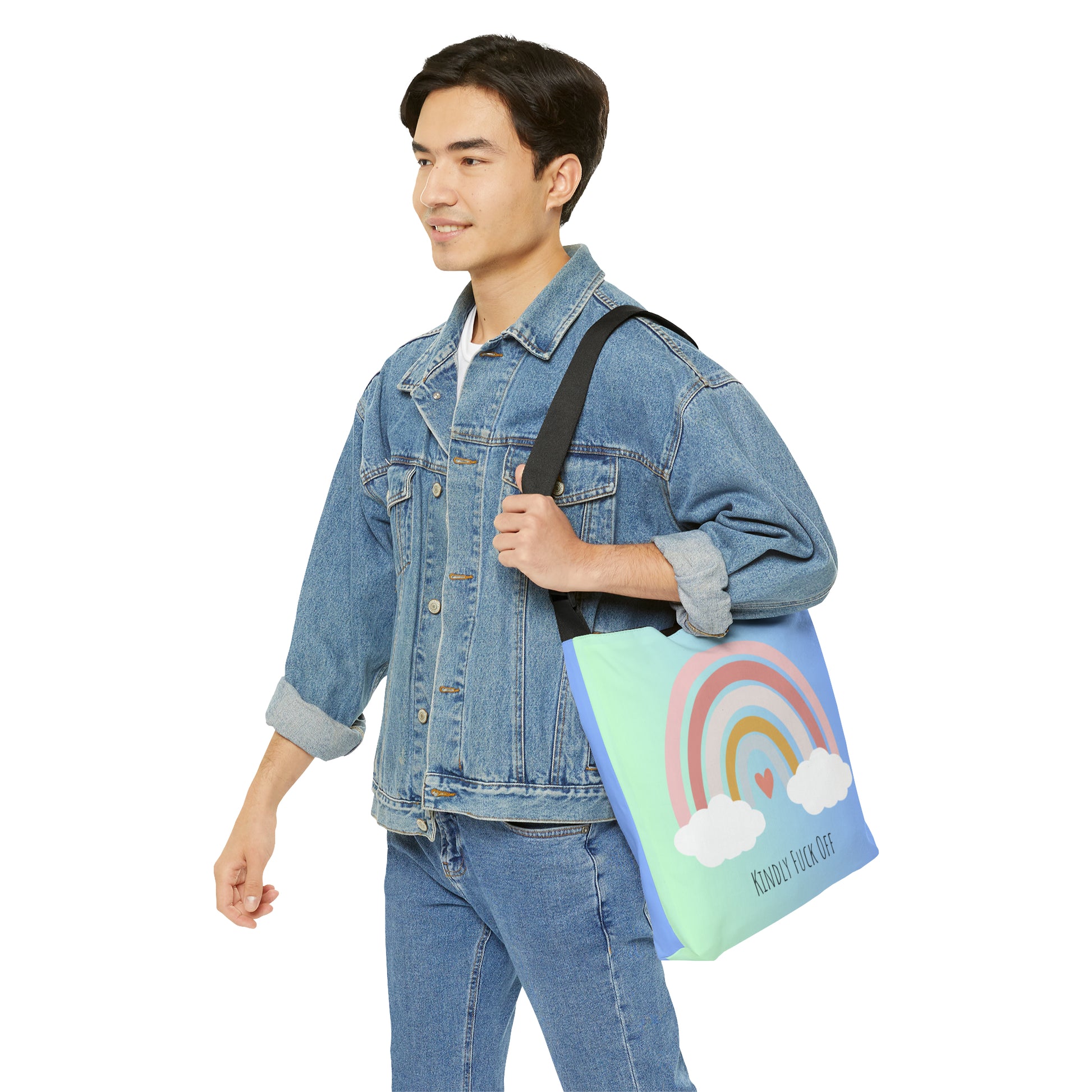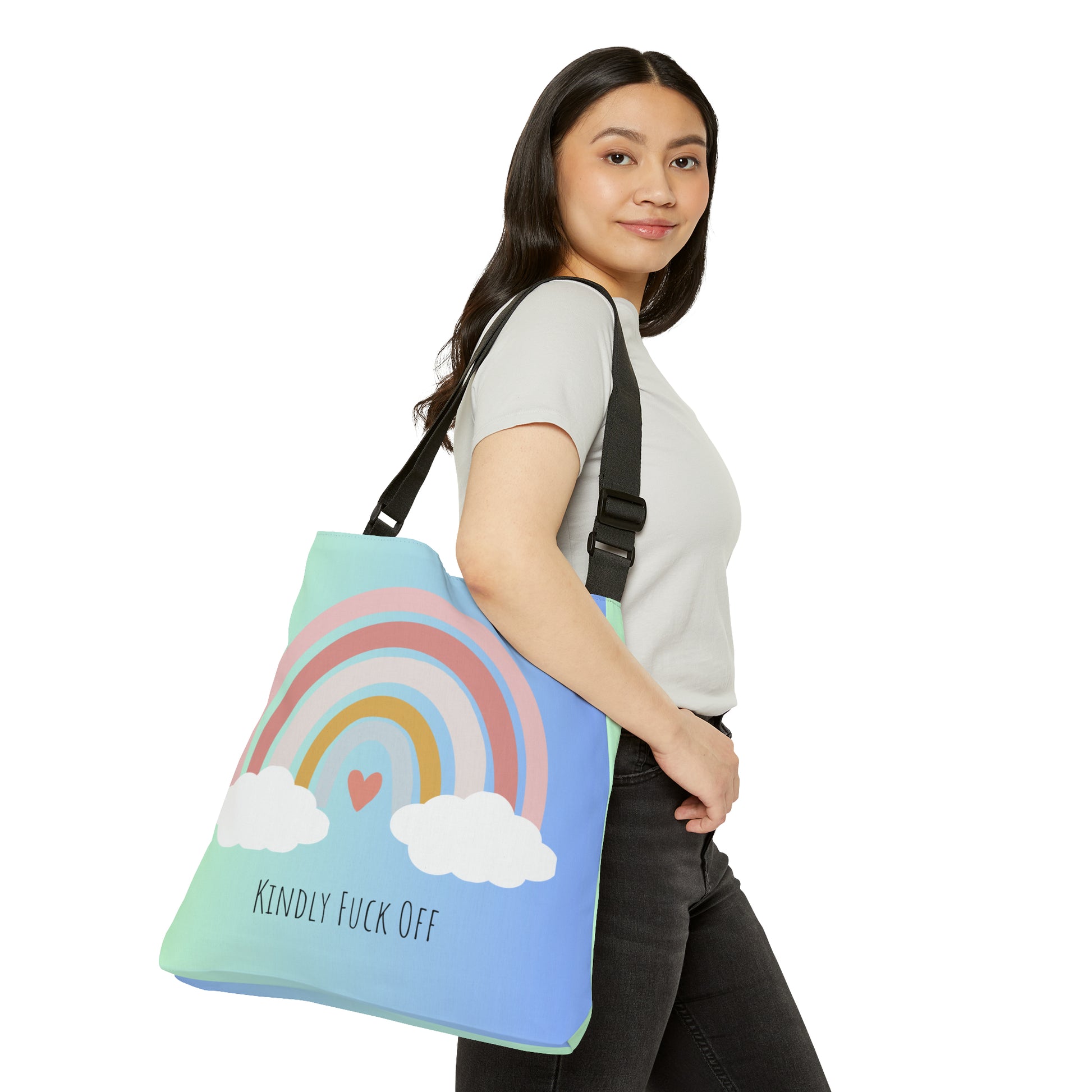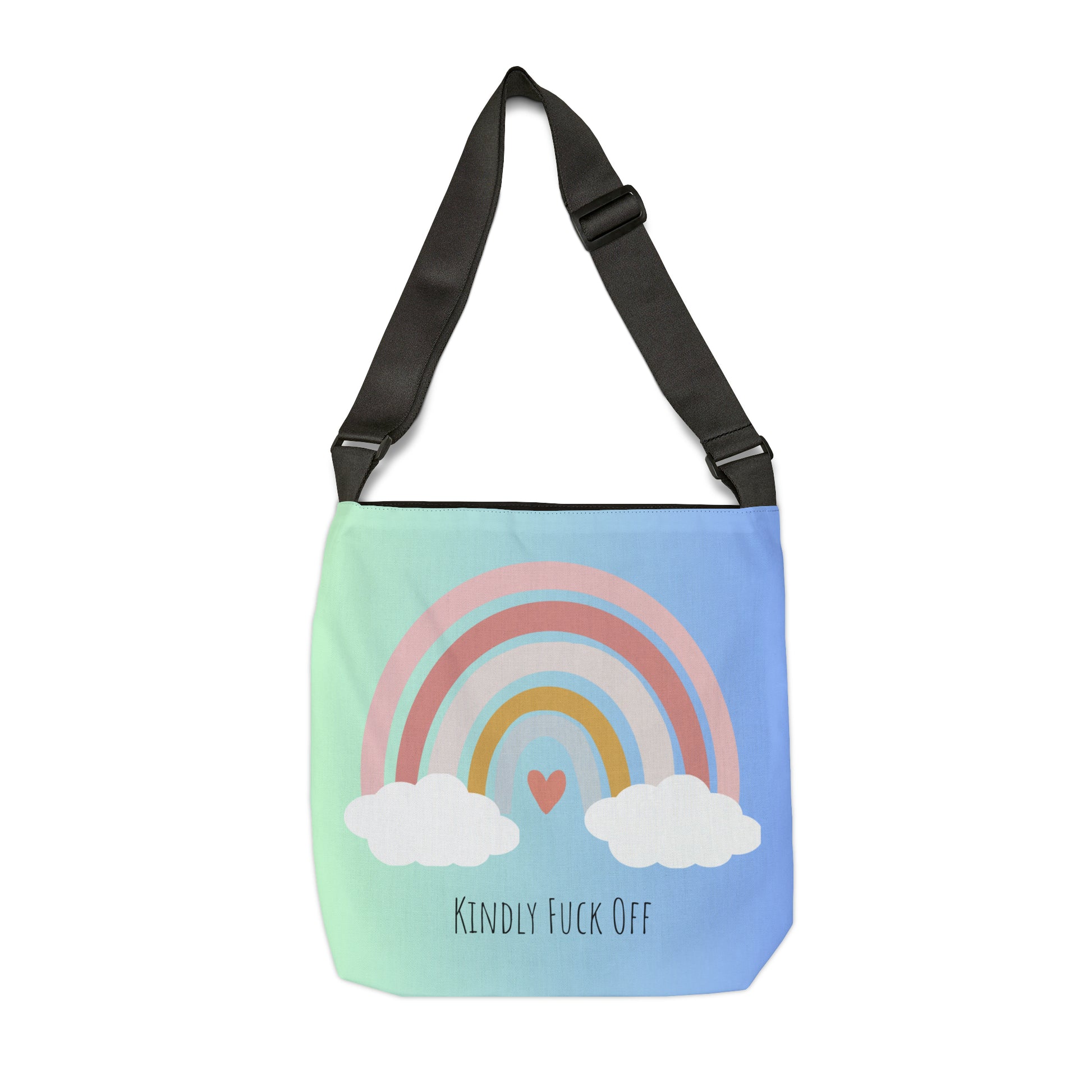 Our Kindly Fuck Off Rainbow Adjustable Tote serves as a fashion-forward accessory. Embrace your uniqueness and let your tote do the talking, as you make a statement wherever you go.