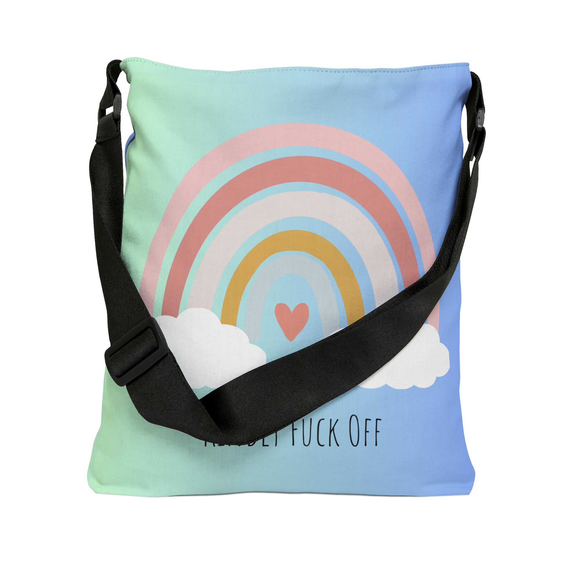 The Fuck Off Rainbow Adjustable Tote, a bold and vibrant accessory that combines a playful attitude with colorful style.