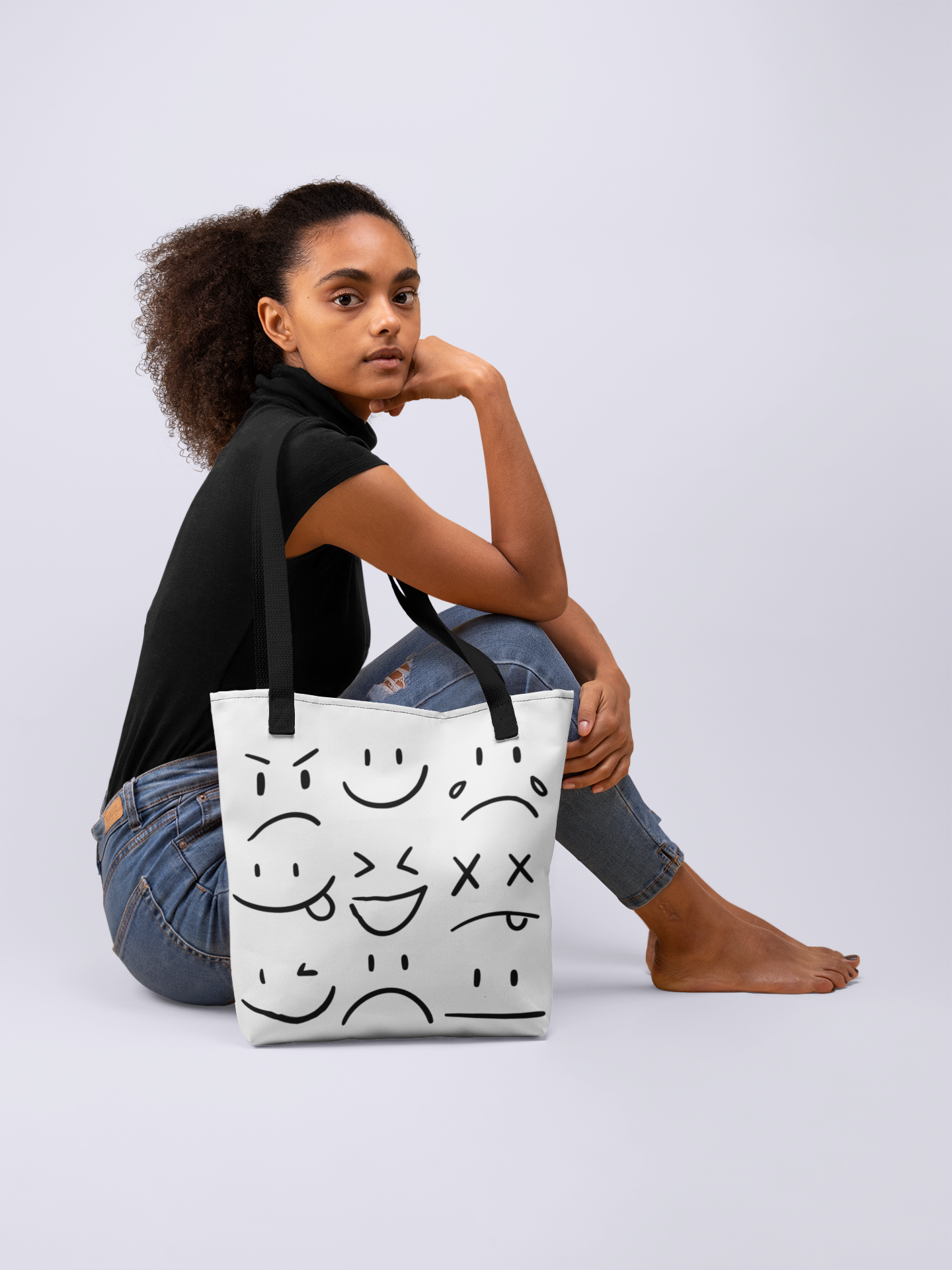 Our Everyday Expressions tote bag features a captivating design of multiple facial expressions. Expressions ranging from joy and excitement to surprise and curiosity adorn the bag. Crafted with high-quality materials, this spacious tote is both stylish and functional. Embrace the power of nonverbal communication and let your emotions shine through with this delightful tote bag. This tote bag comes is three sizes making it a perfect fit to carry all your daily essentials. The bag is made with a durable, lightweight material, built to last through the rollercoaster of day-to-day emotions. A great gift idea for others.