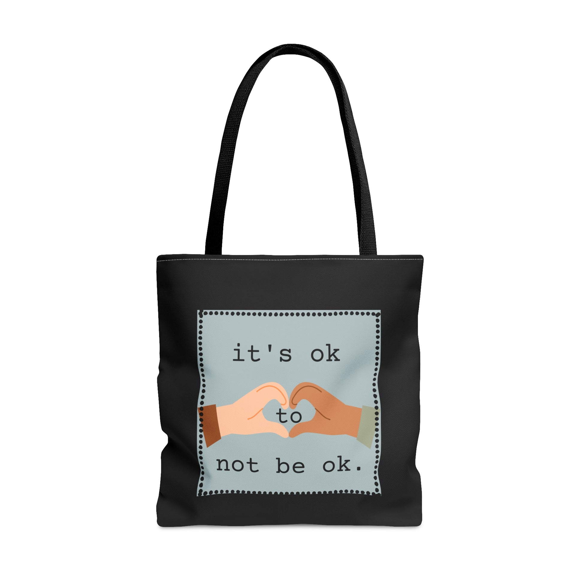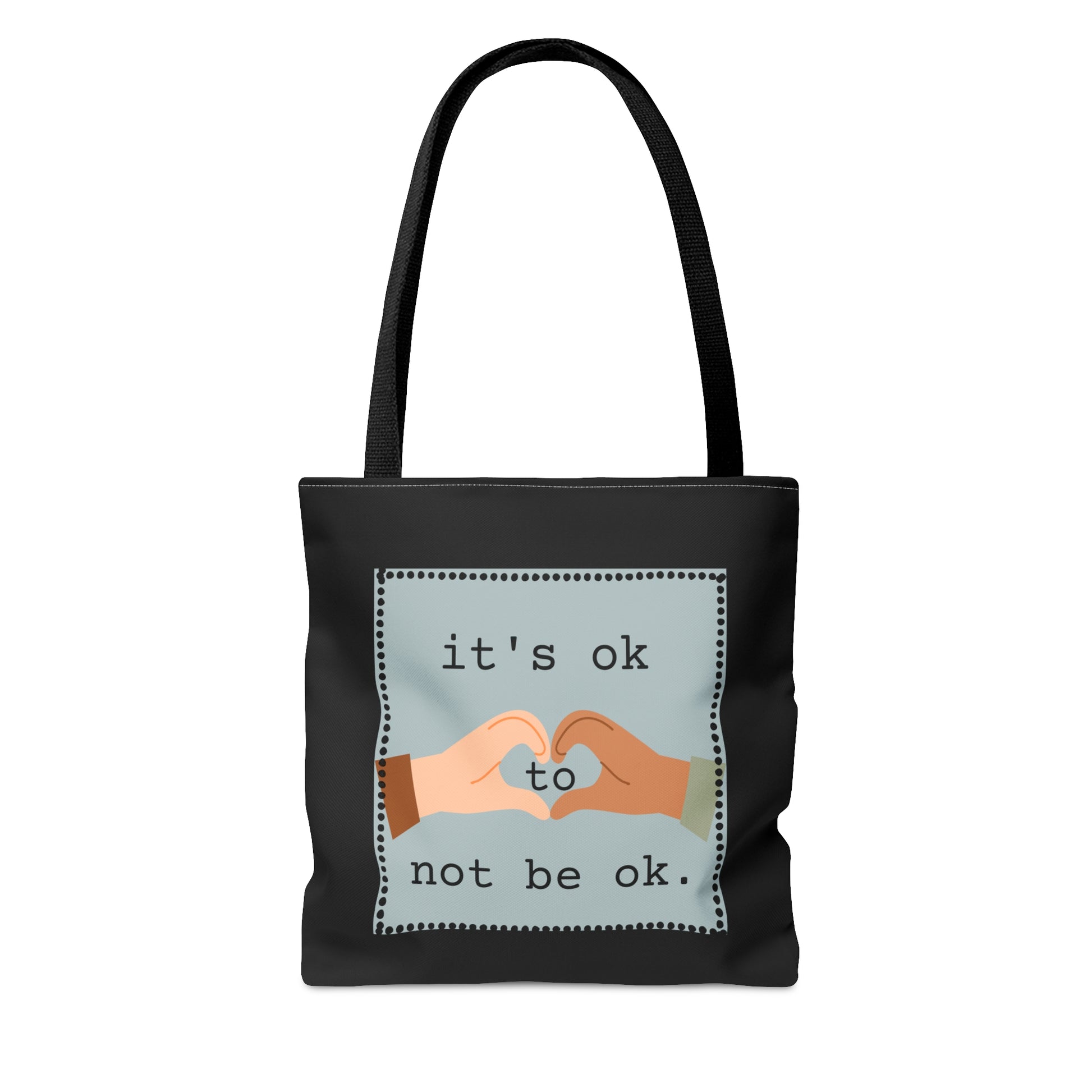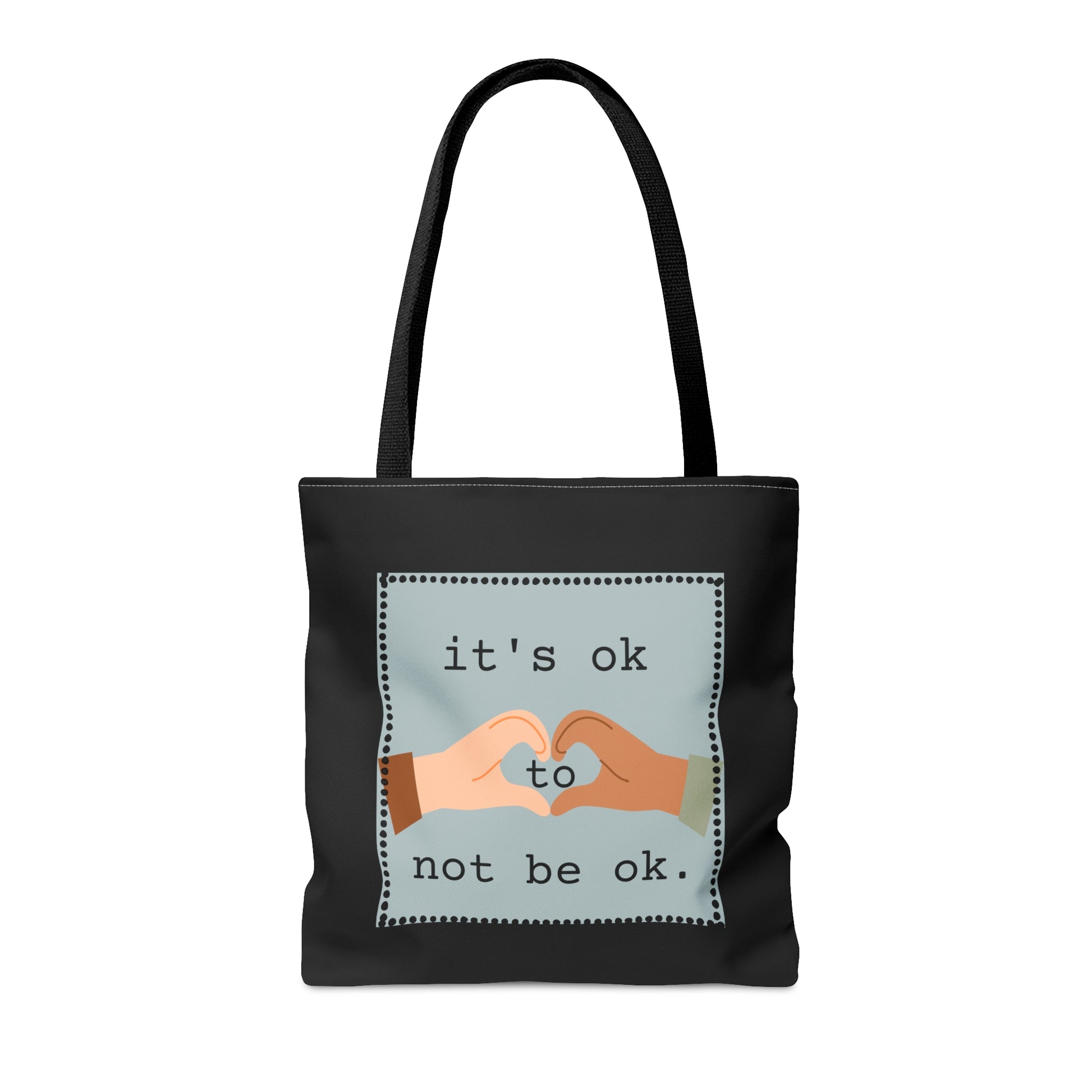Crafted from high-quality materials, this black tote features the empowering phrase "It's Okay to Not Be Okay" serves as a daily reminder that your feelings are valid. Hands and Heart tote bag is offered in three sizes. The spacious interior provides ample room for all your essentials.