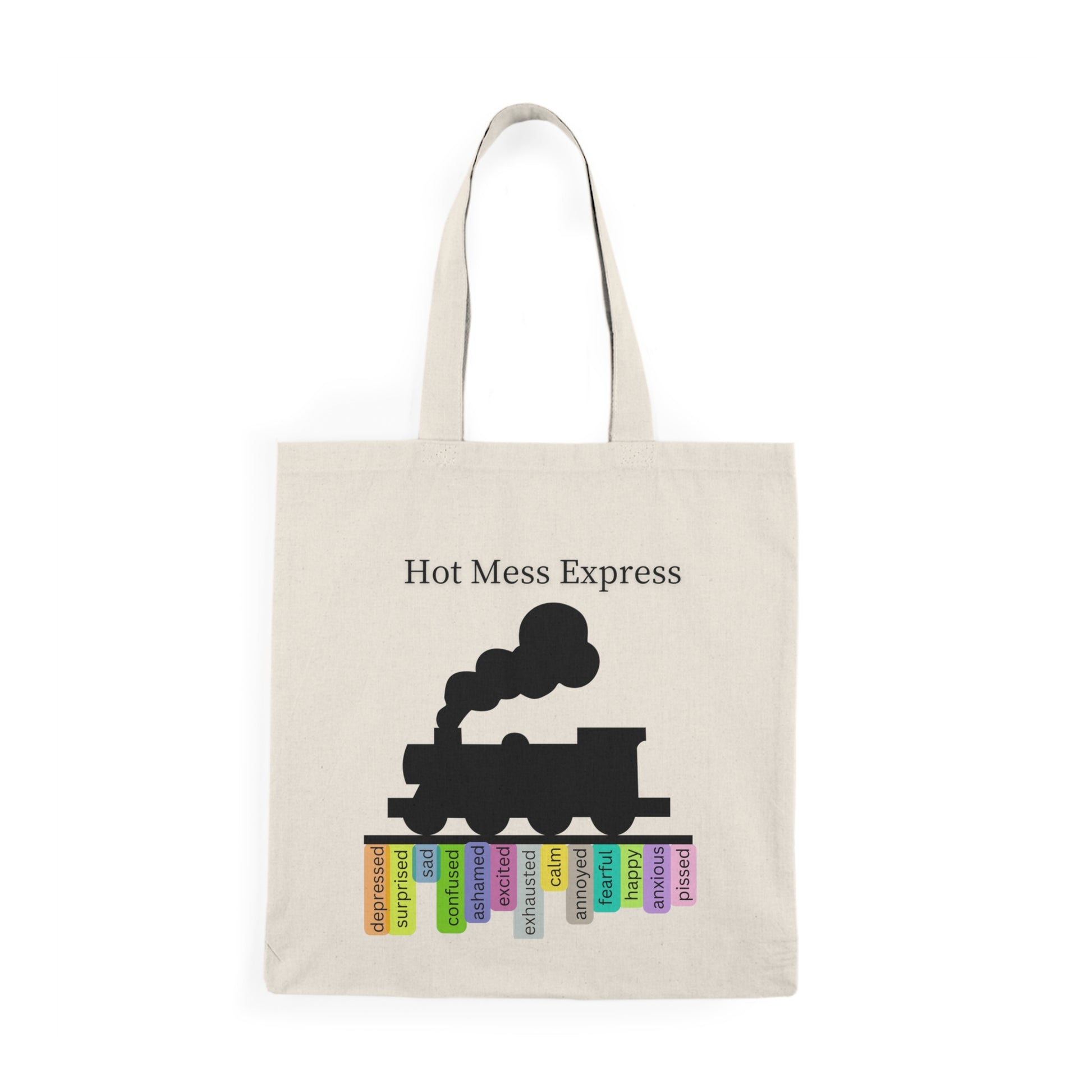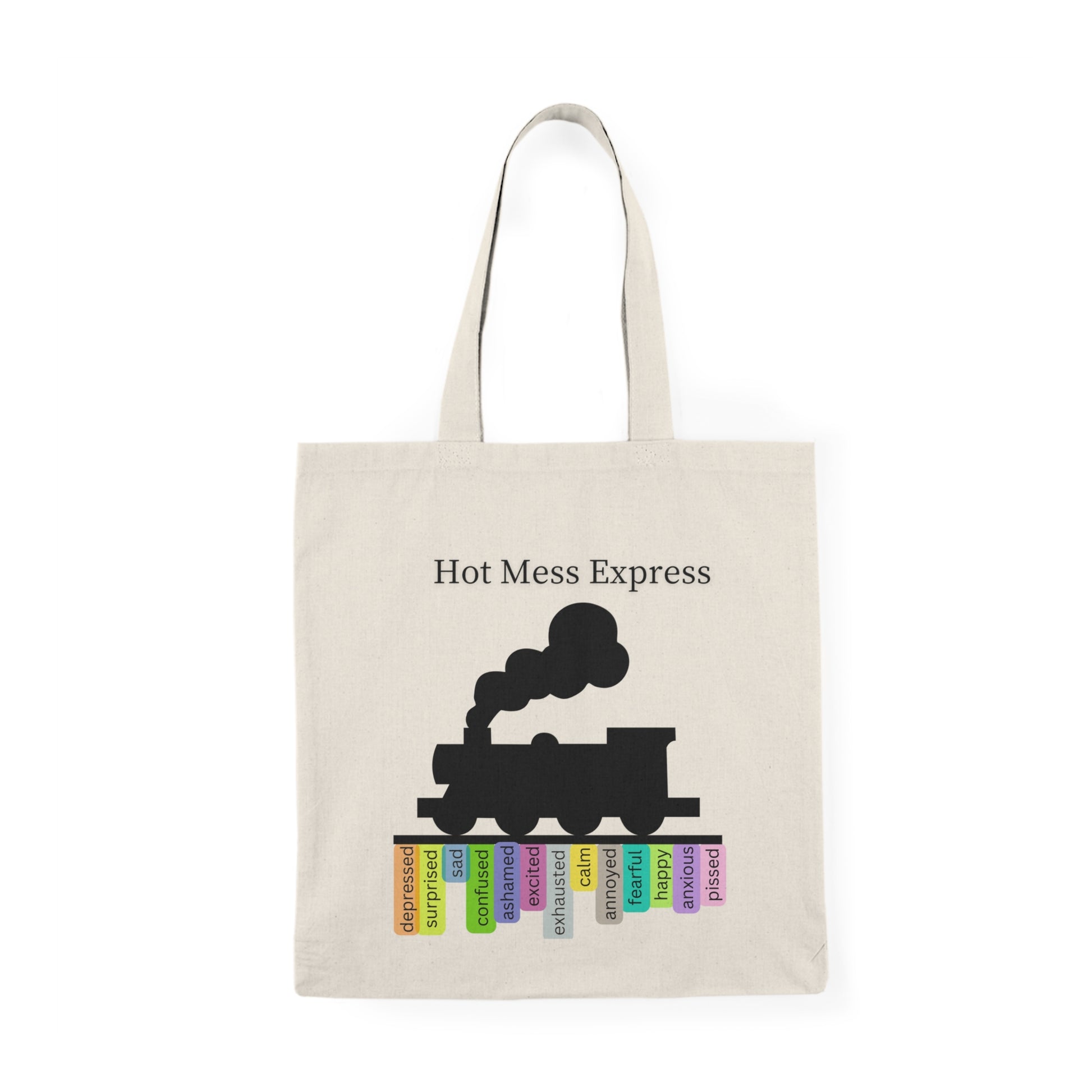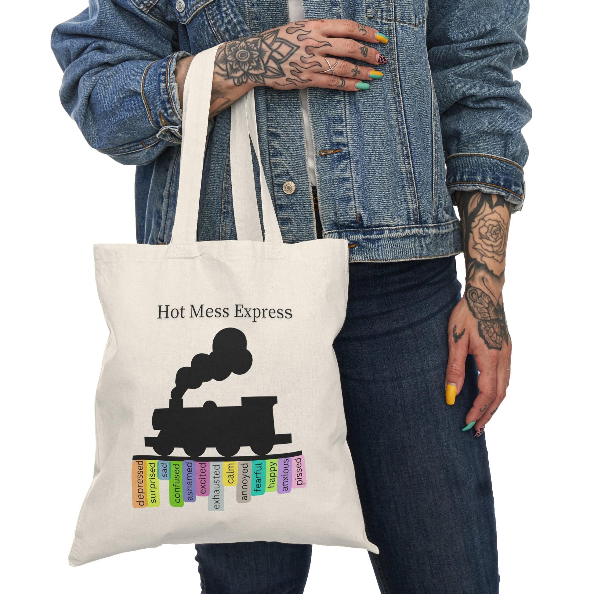 The Hot Mess Express Tote Bag features a captivating train graphic that adds a touch of whimsy and energy to your everyday style. The design is expertly crafted, capturing the essence of a lively journey and reflecting the excitement of life's unpredictable moments.