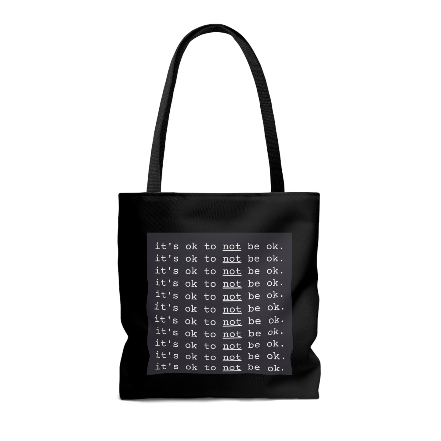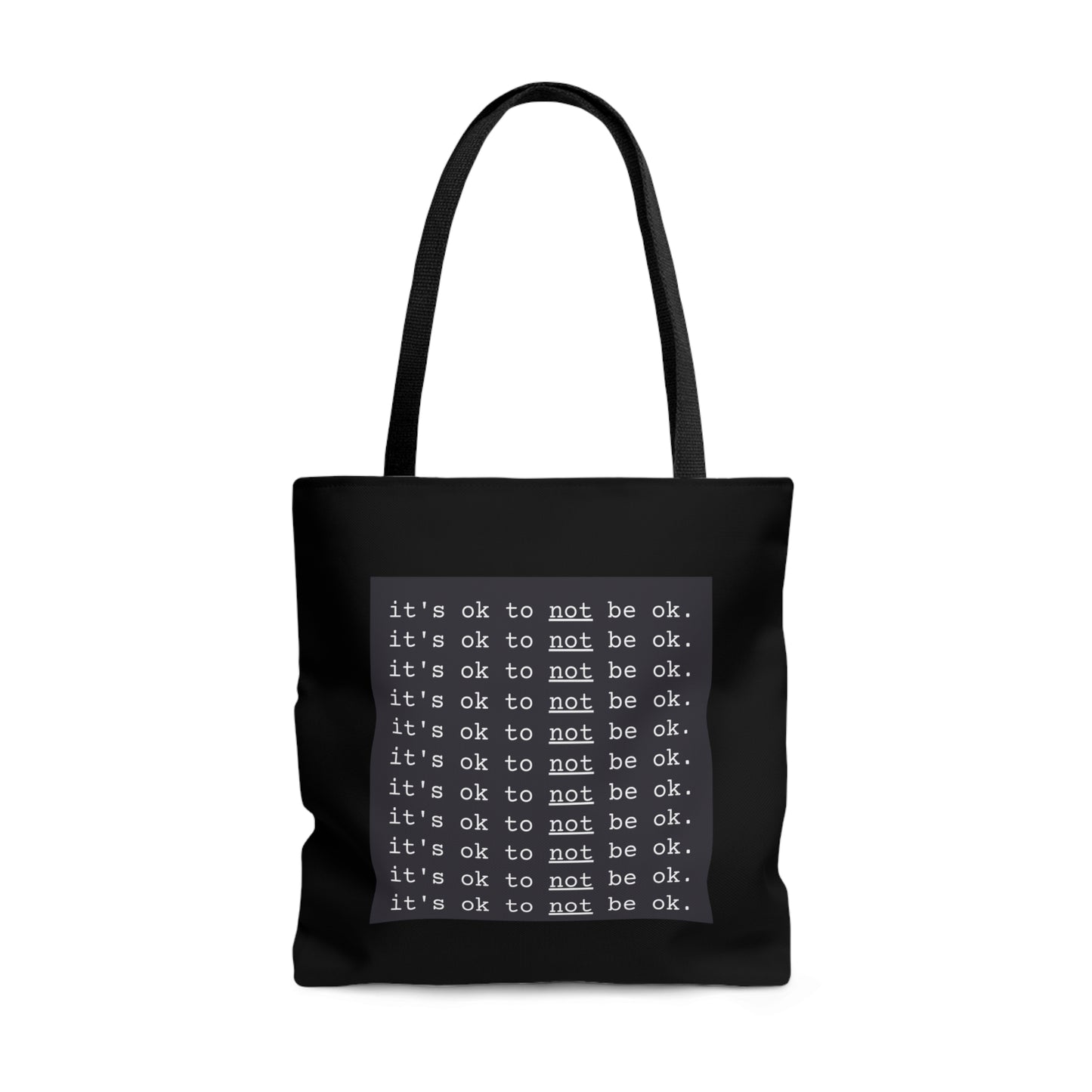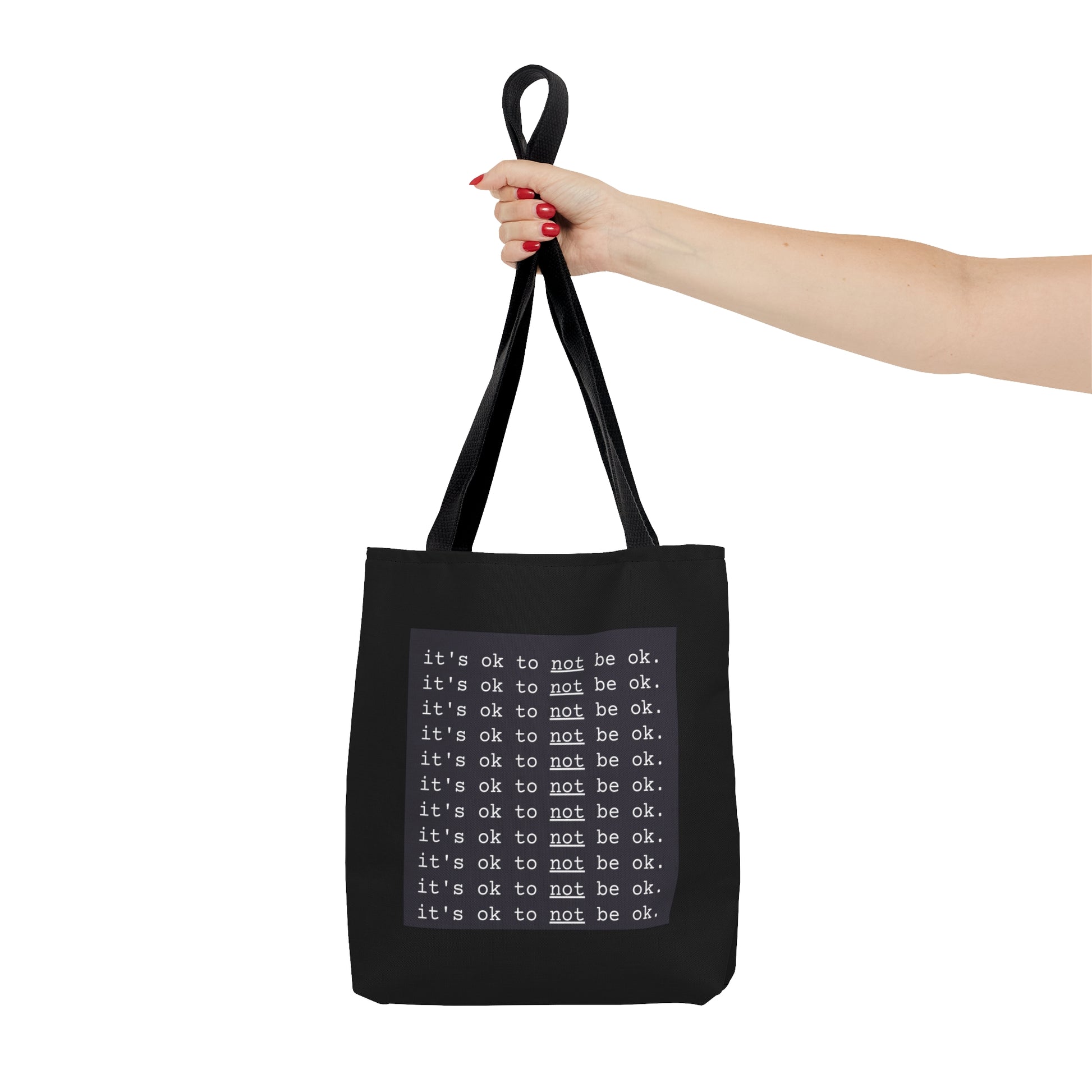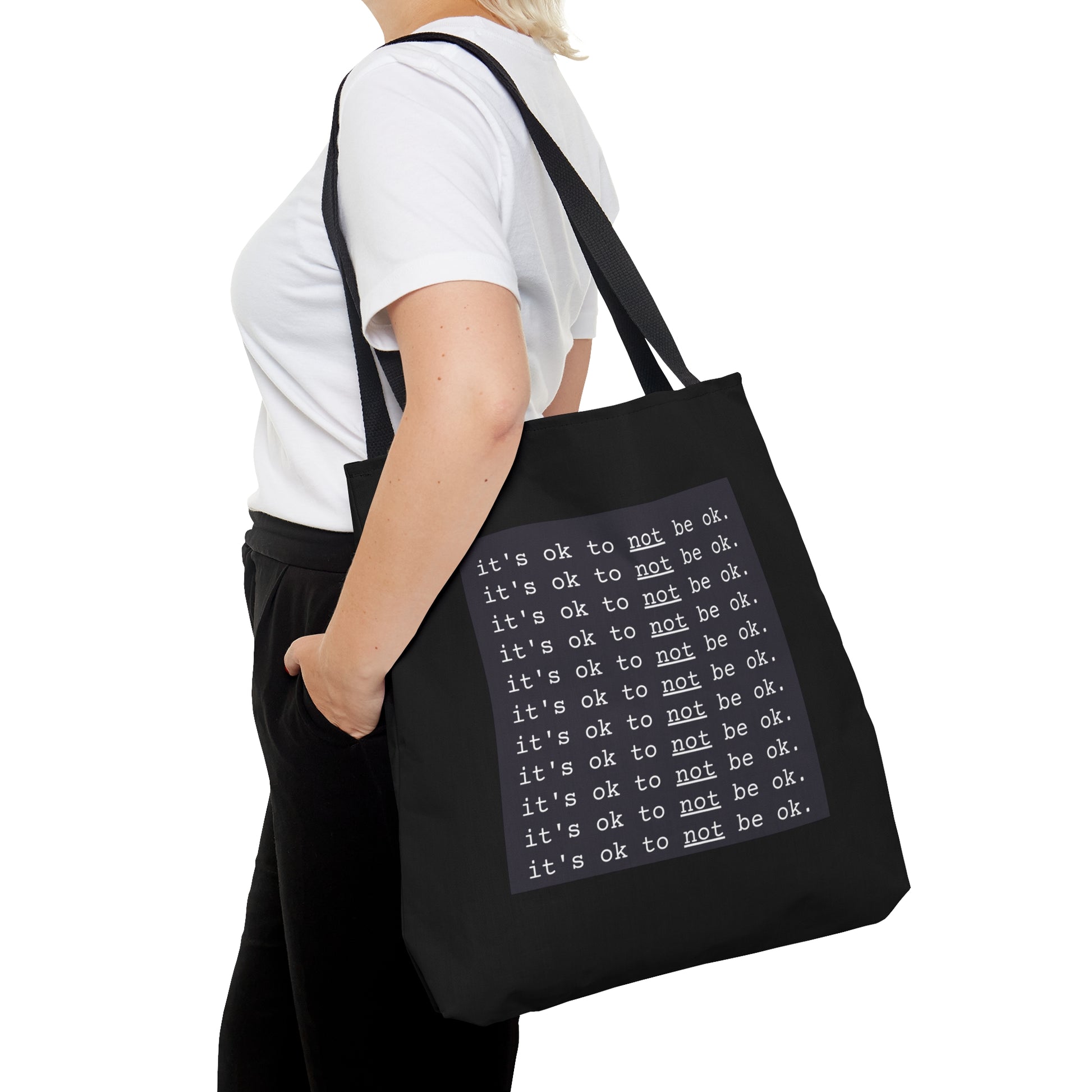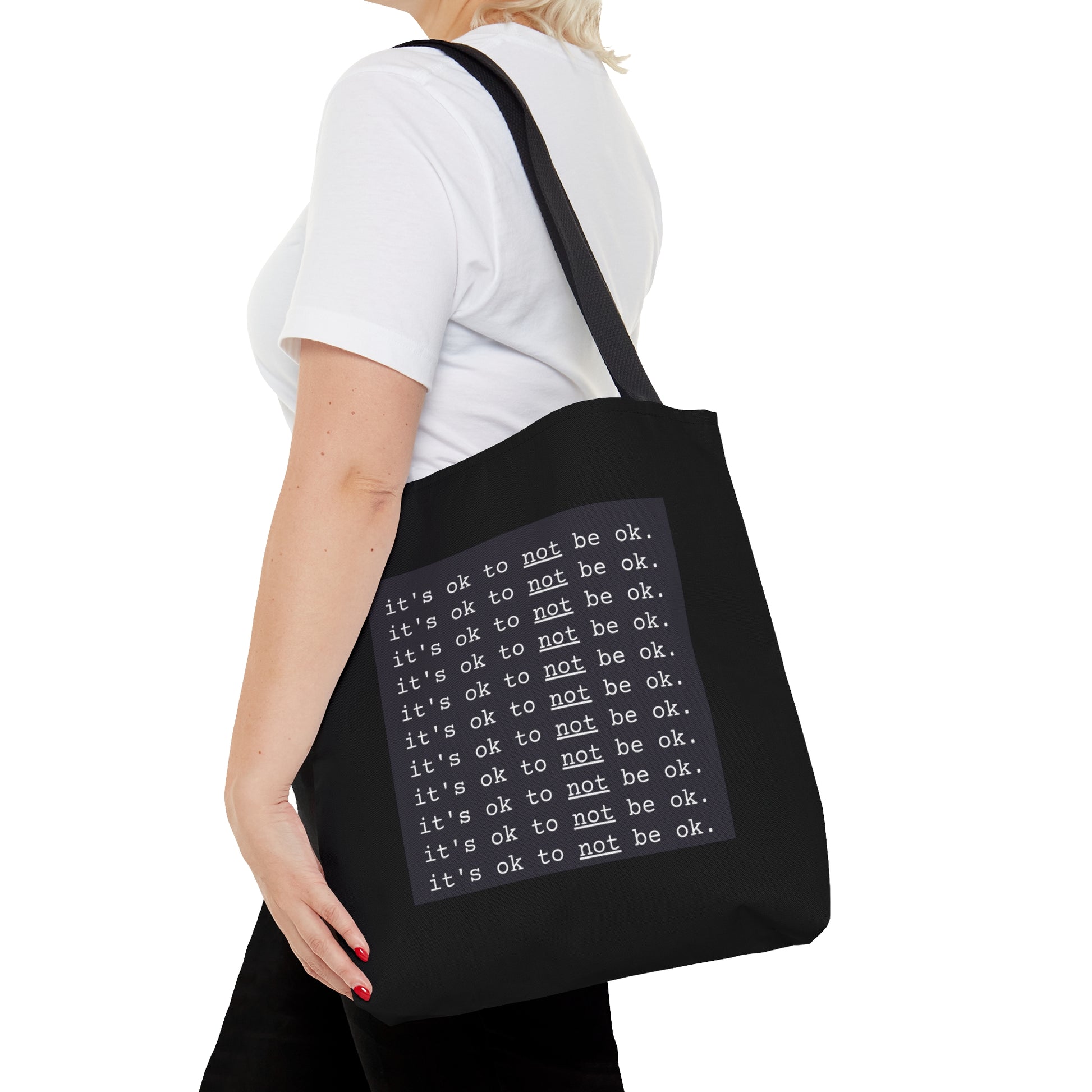Crafted from high-quality materials, this black tote features the empowering phrase "It's Okay to Not Be Okay" repeated throughout, serving as a daily reminder that your feelings are valid. The spacious interior provides ample room for all your essentials, whether it's books, groceries, or everyday items.