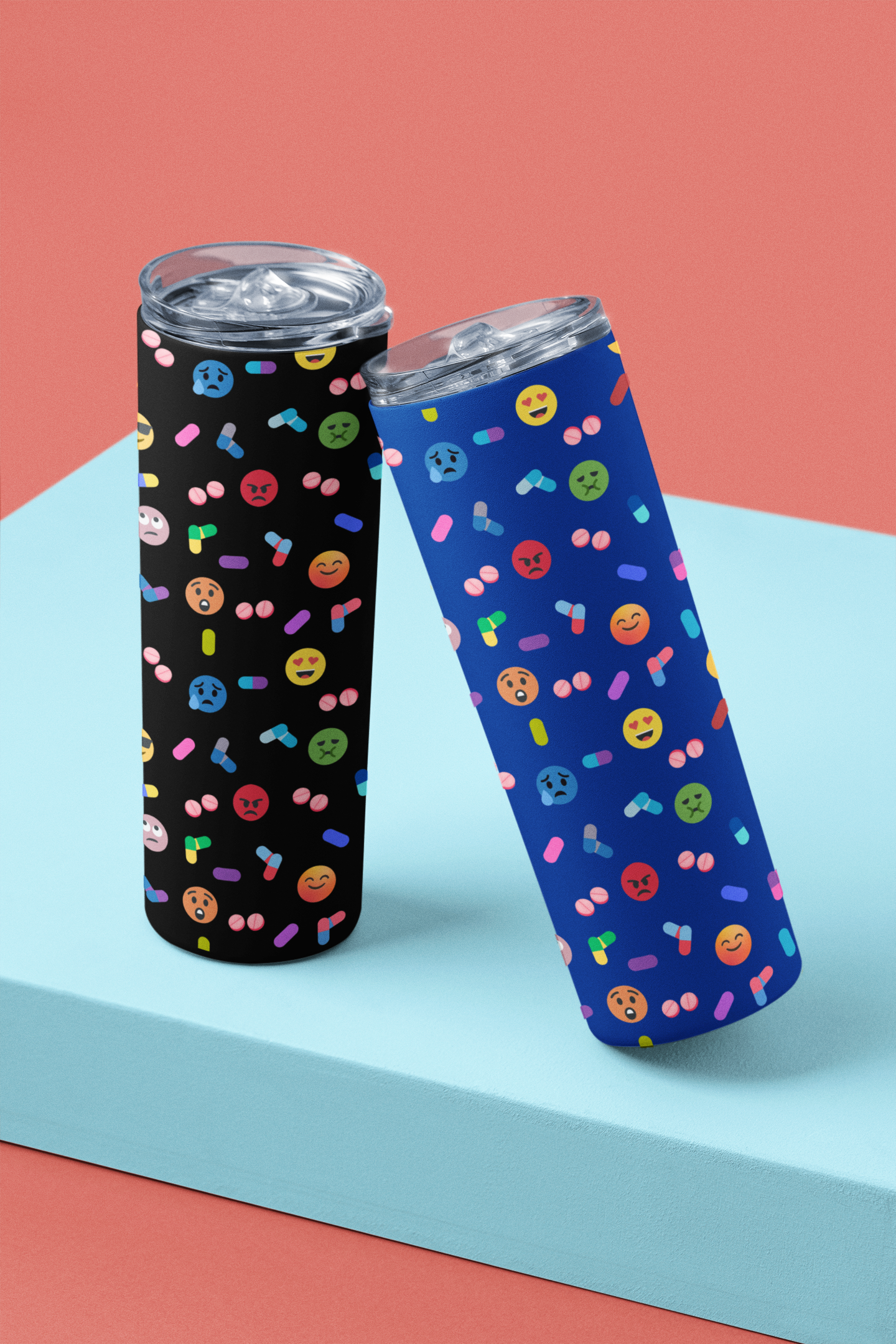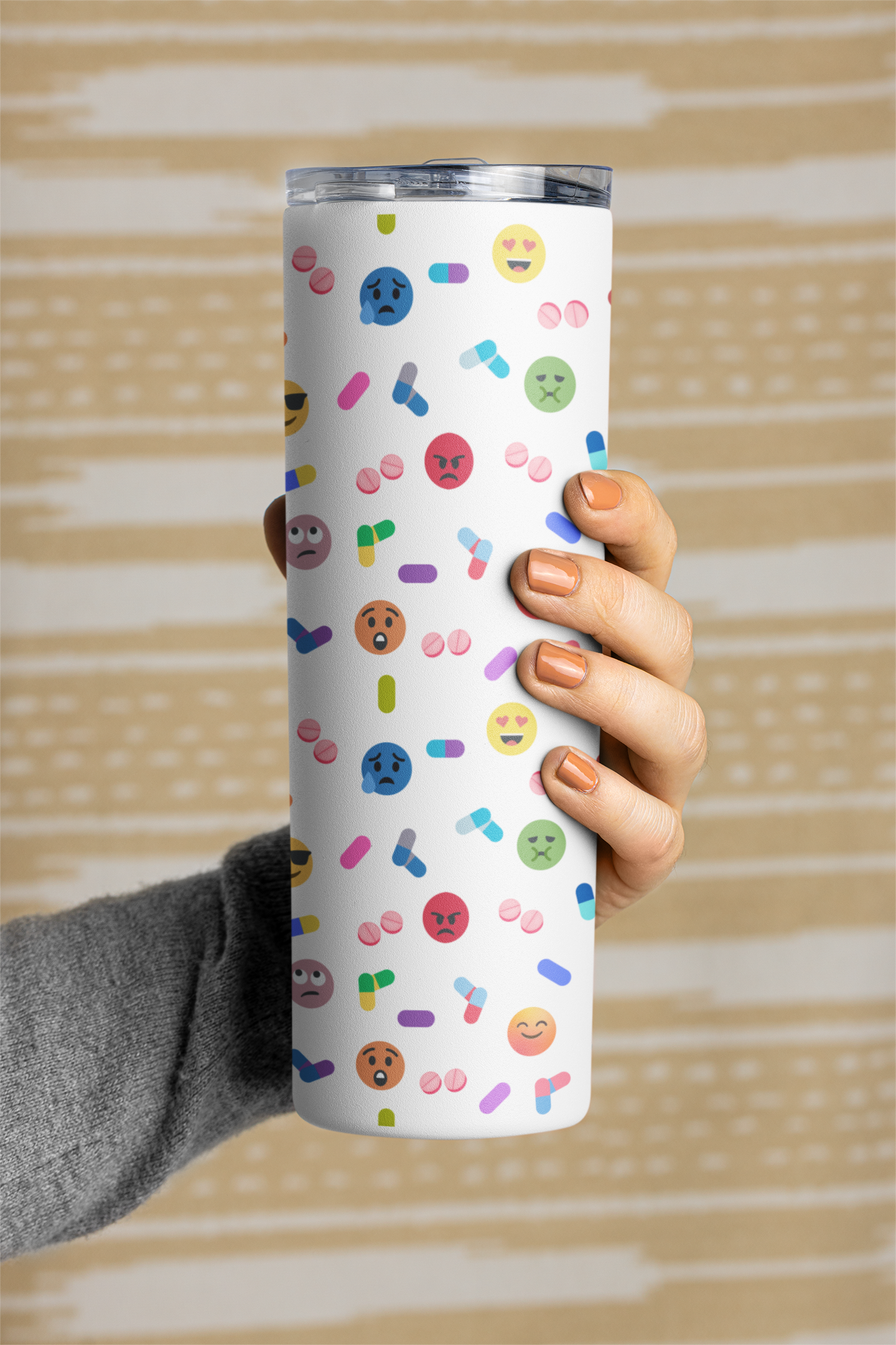 Our Popping skinny tumbler represents acceptance, understanding, and the importance of normalizing the use of mental health medications. We believe that taking care of your mental well-being should be as ordinary as sipping your favorite beverage from this extraordinary tumbler. Whether you swallowing your pills with a hot or cold drink, this tumbler keep your drinks hot for 12h and cold for 24h, making them the perfect sipping companion all year round.