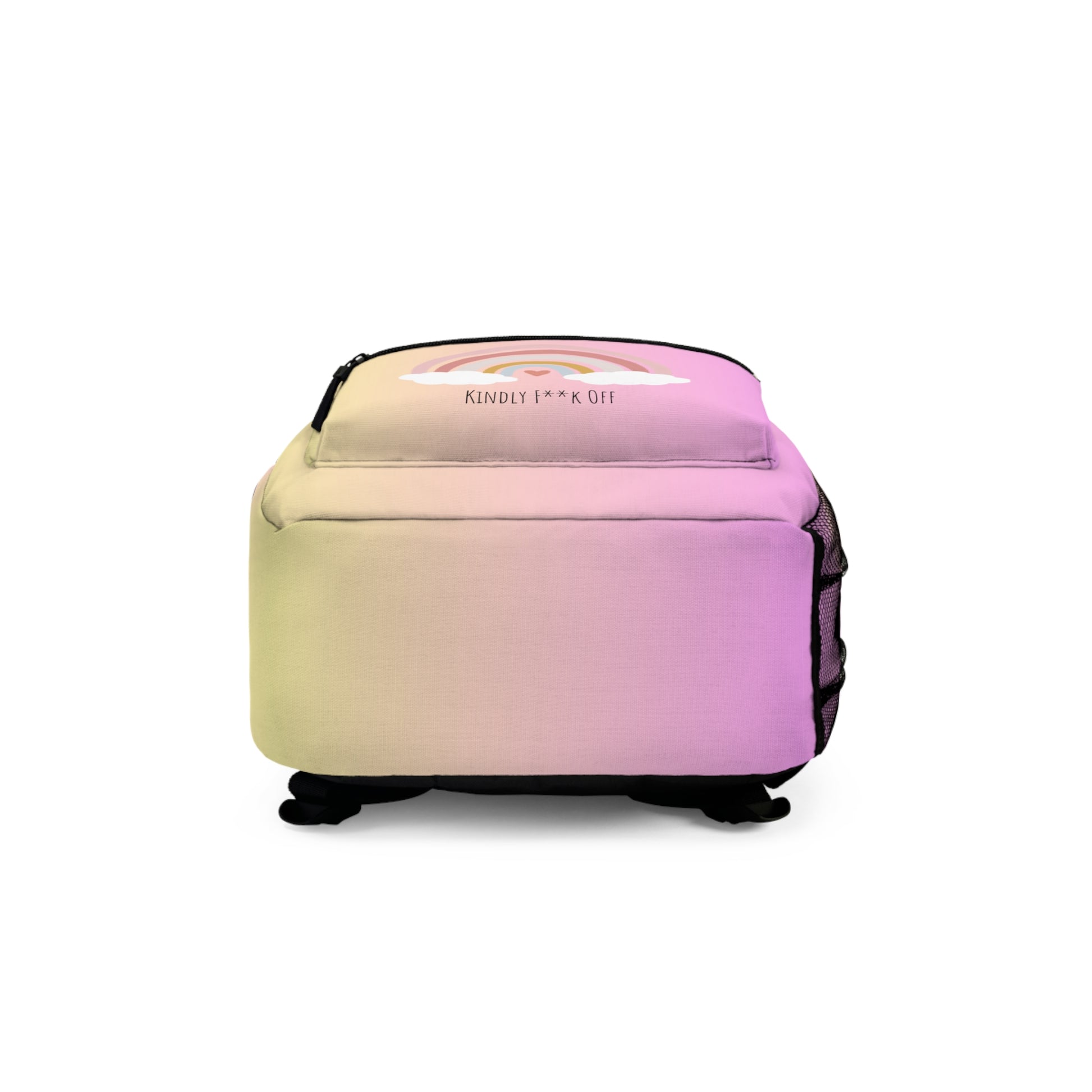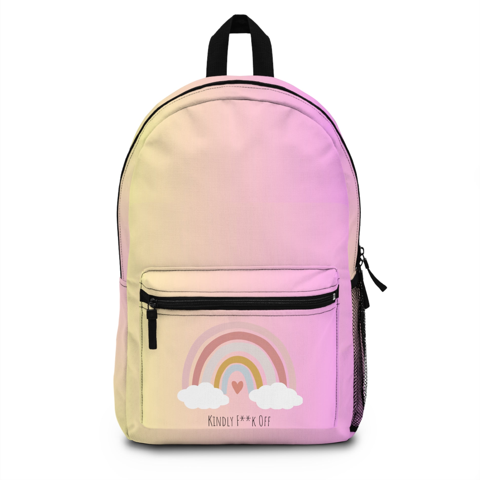 Step into a world of vibrant self-expression with our Rainbow Kindly F**k Off Backpack. This backpack is not just an accessory—it's a statement, a bold narrative of individuality and attitude.