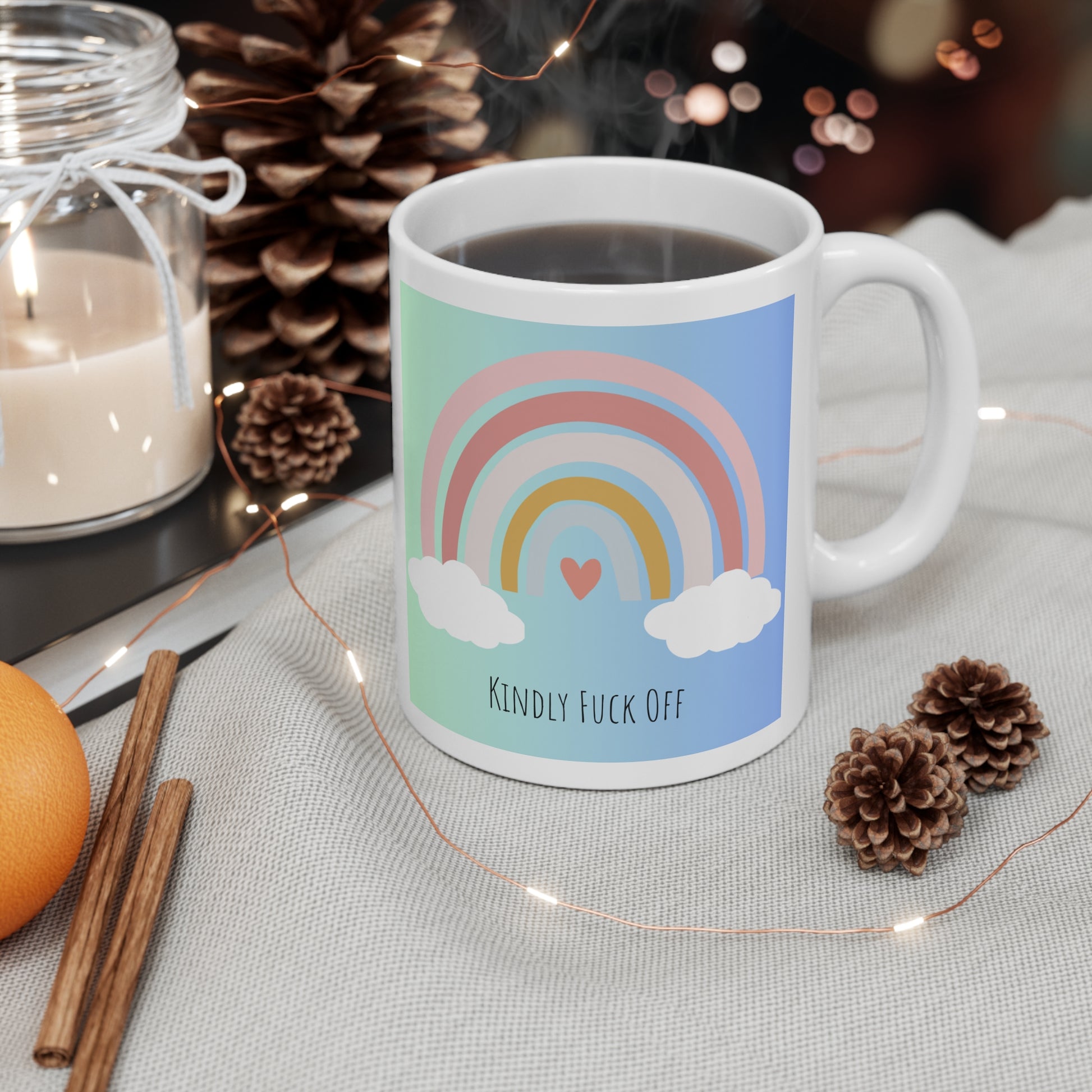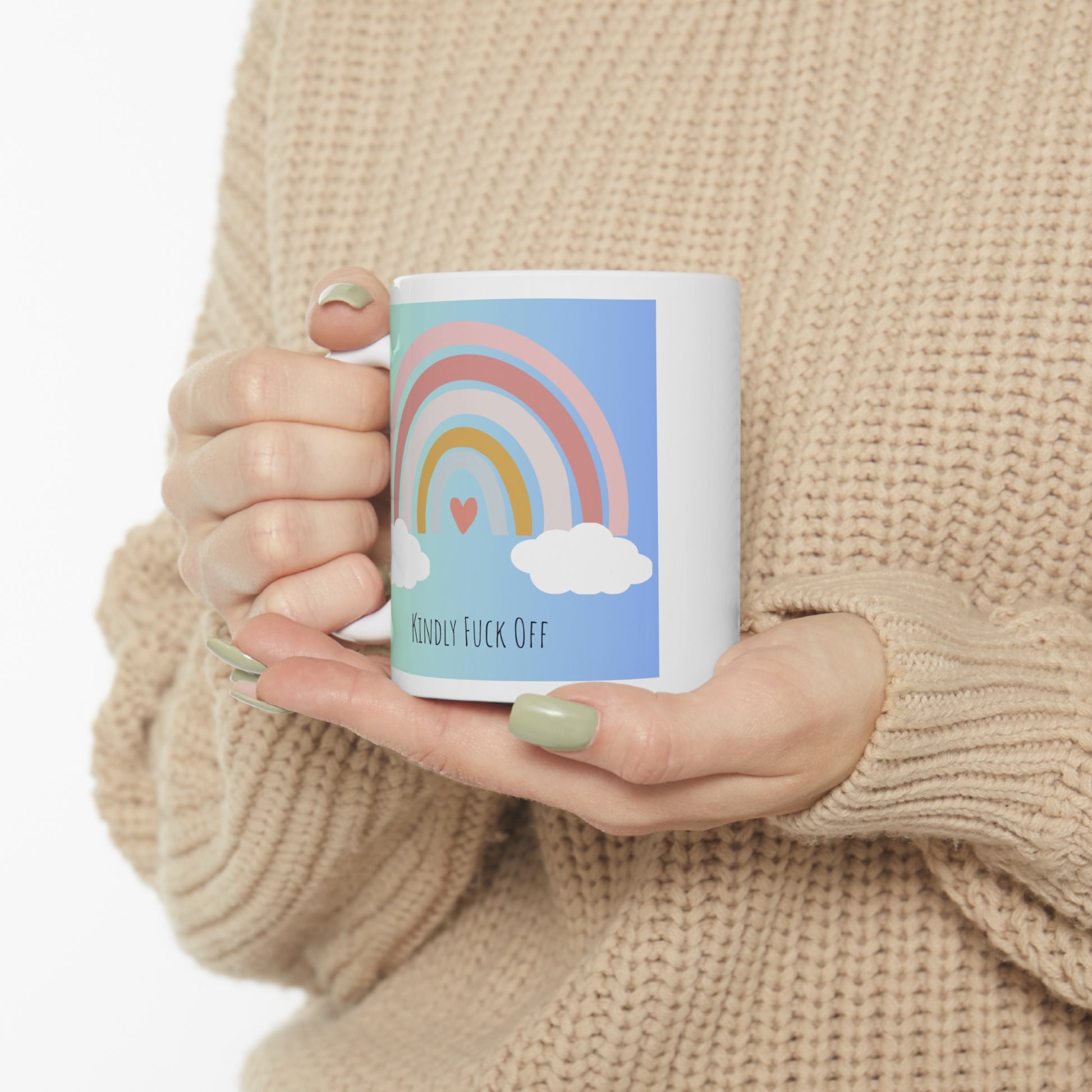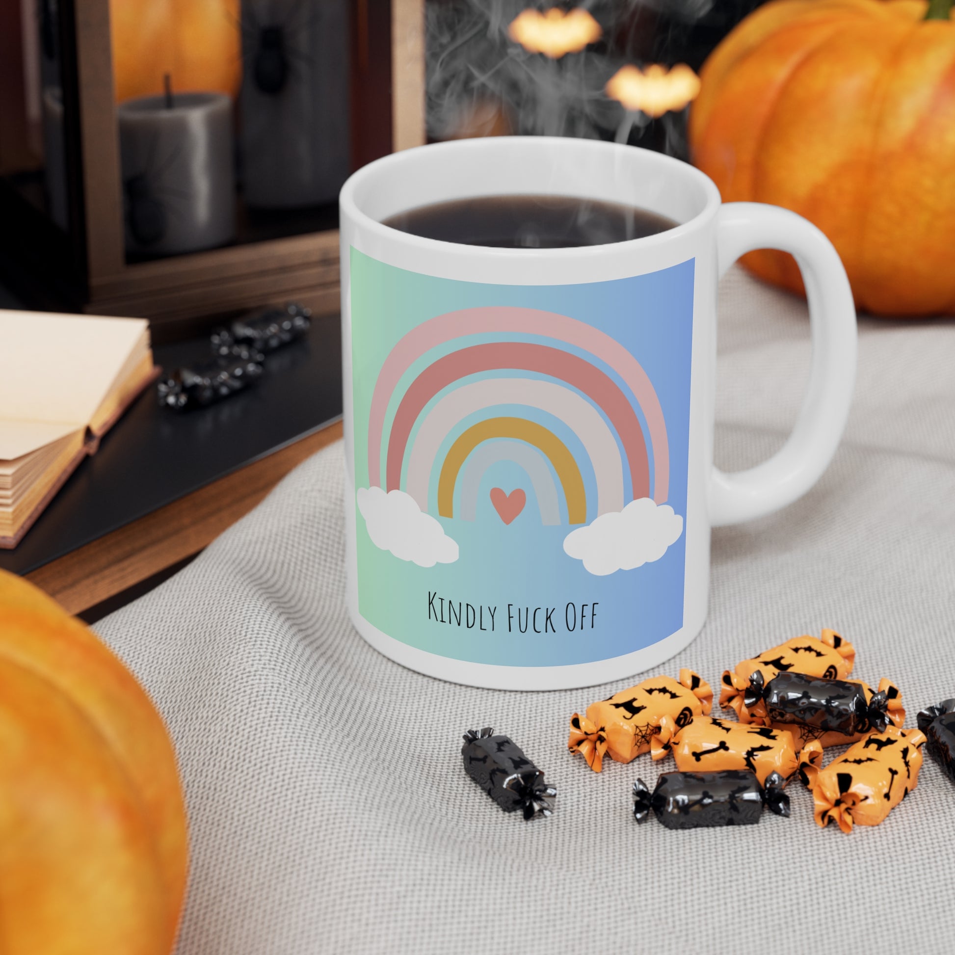 Whether you're enjoying a peaceful morning alone or sending a clear message to those around you, our "Rainbow, Fuck Off" Coffee Mug is a fun and expressive addition to your drinkware collection. It also makes a great gift for friends, family members, or coworkers who appreciate a touch of humor and a splash of color in their daily routine. So, kick back, relax, sip your favorite beverage and kindly tell the world to "fuck off" with a smile.