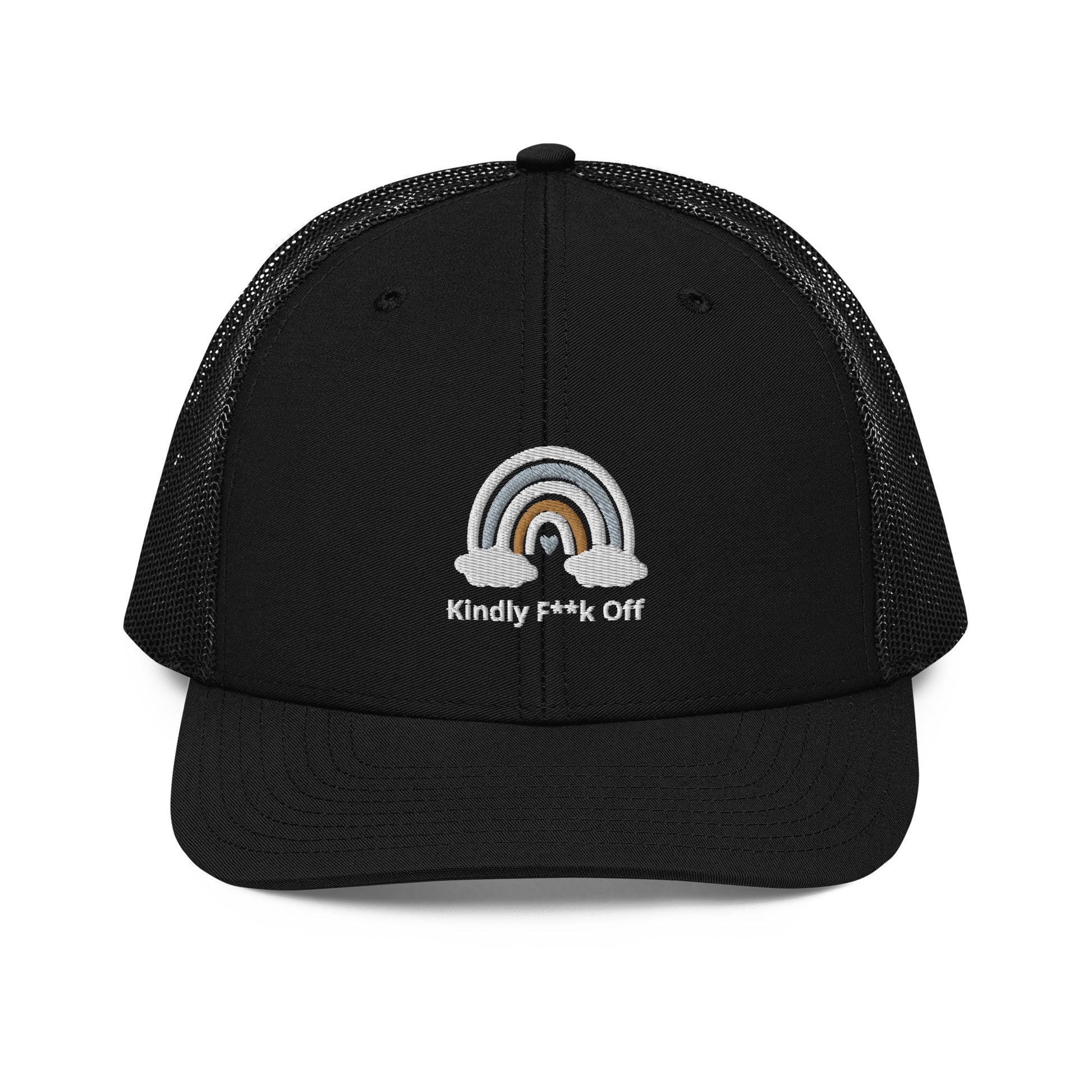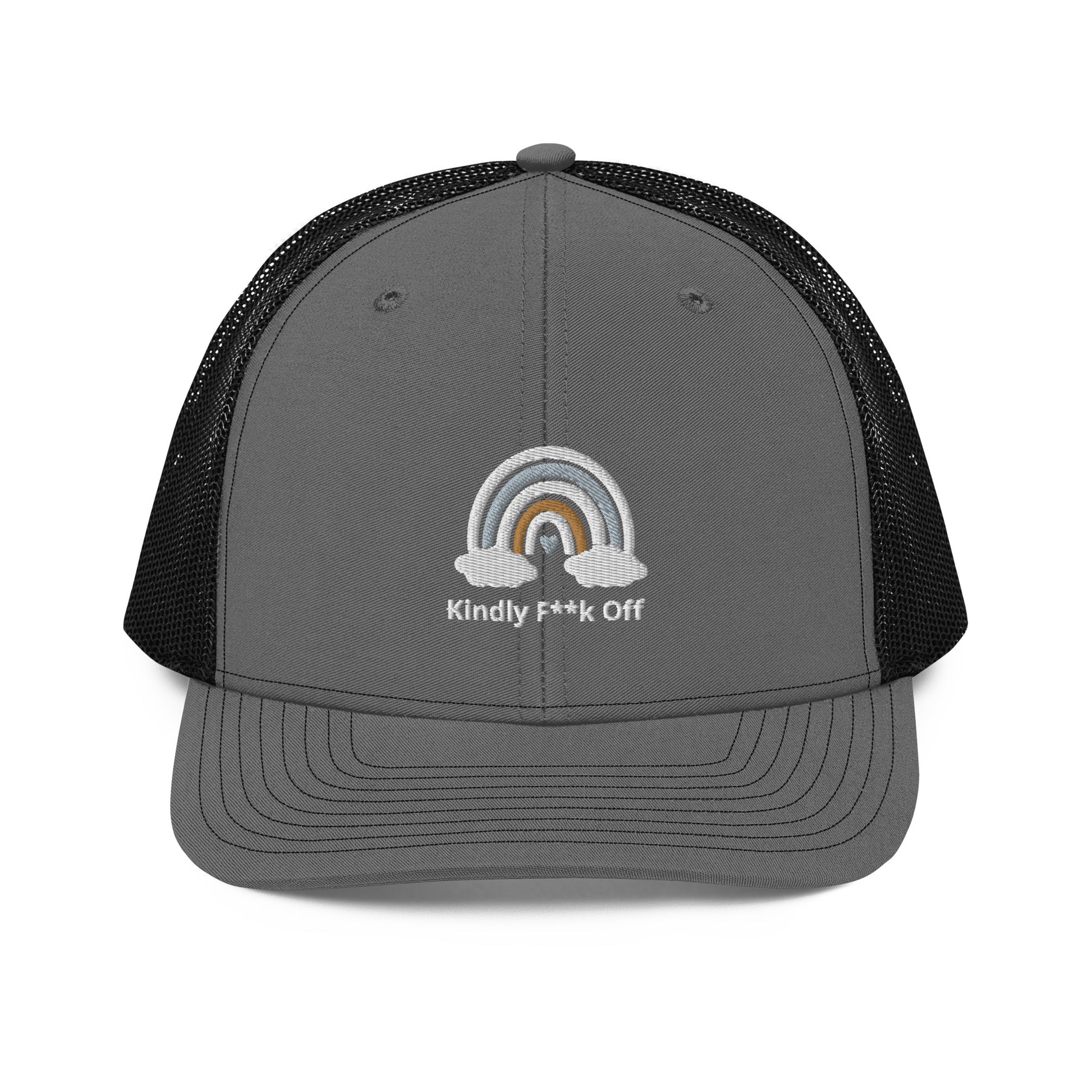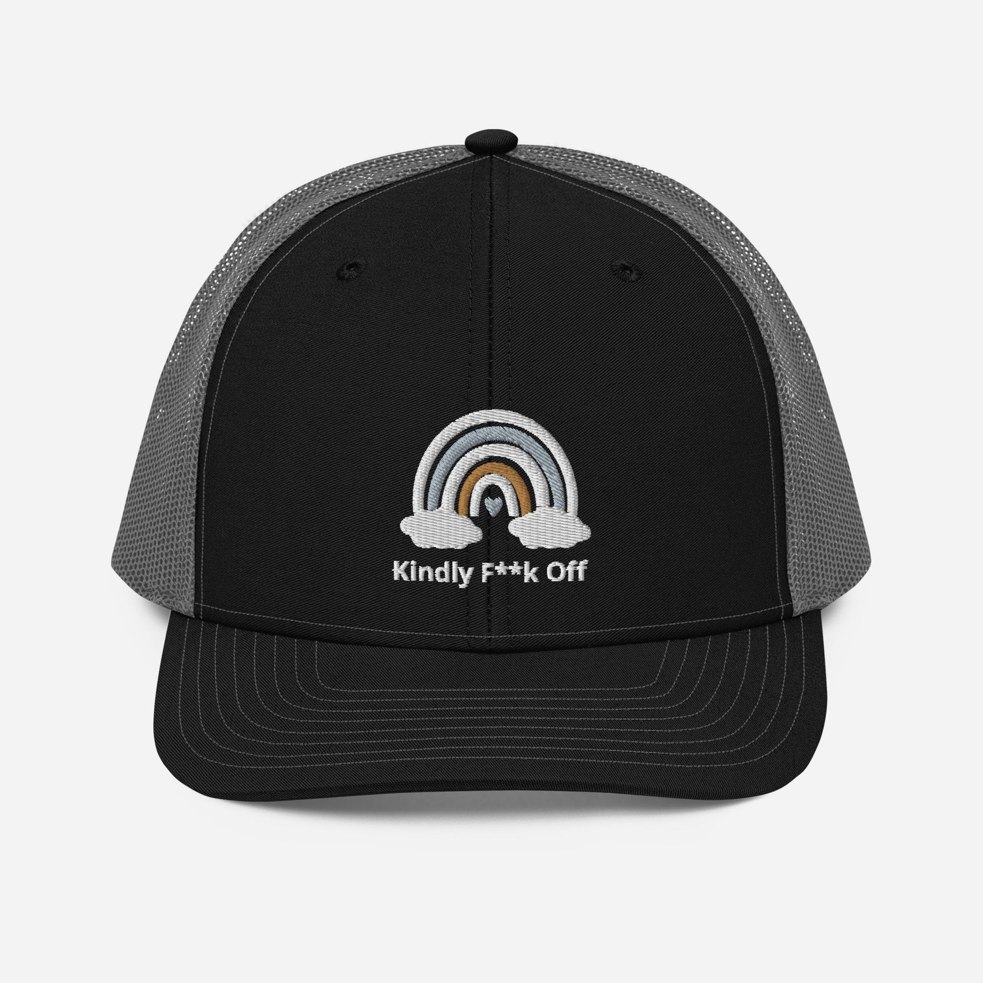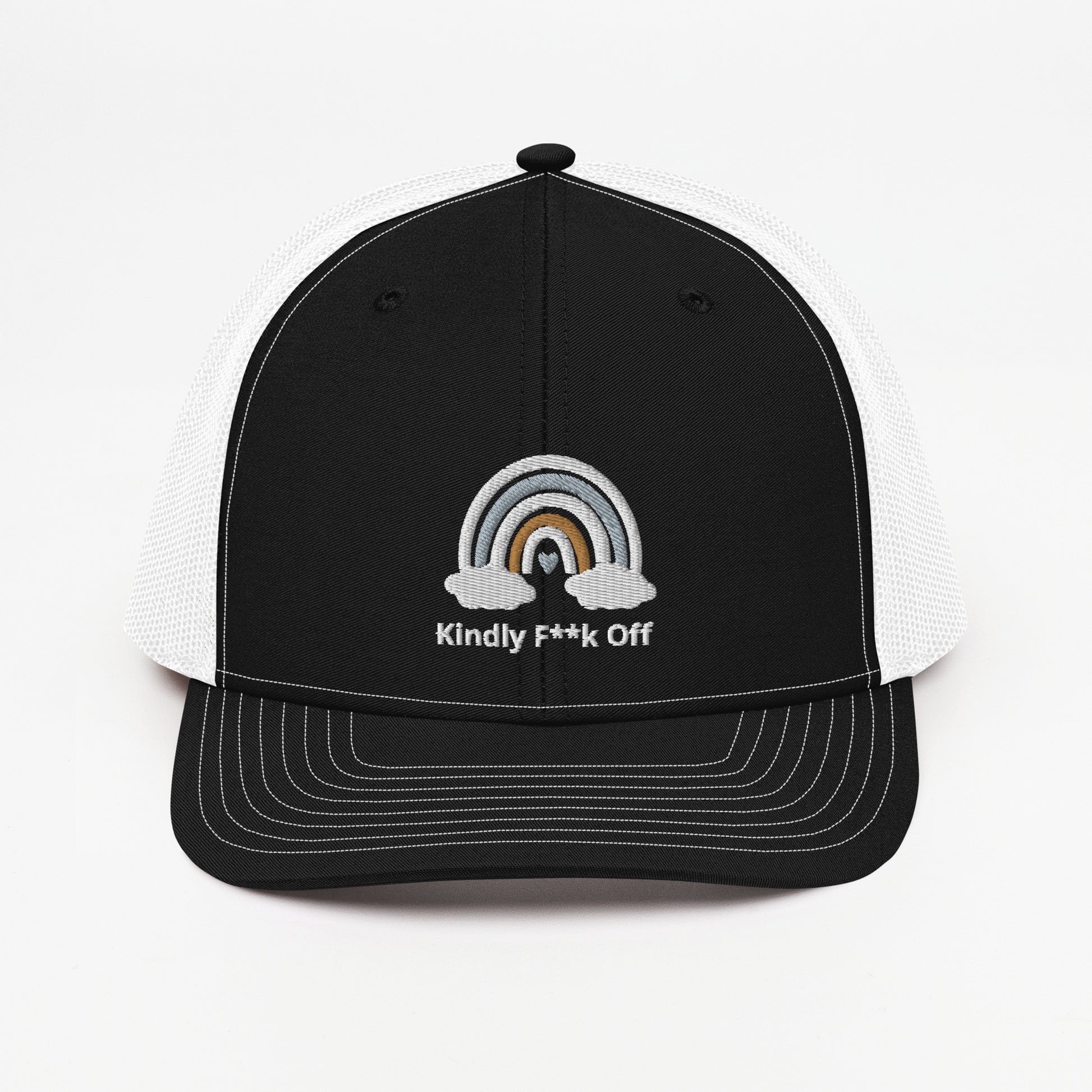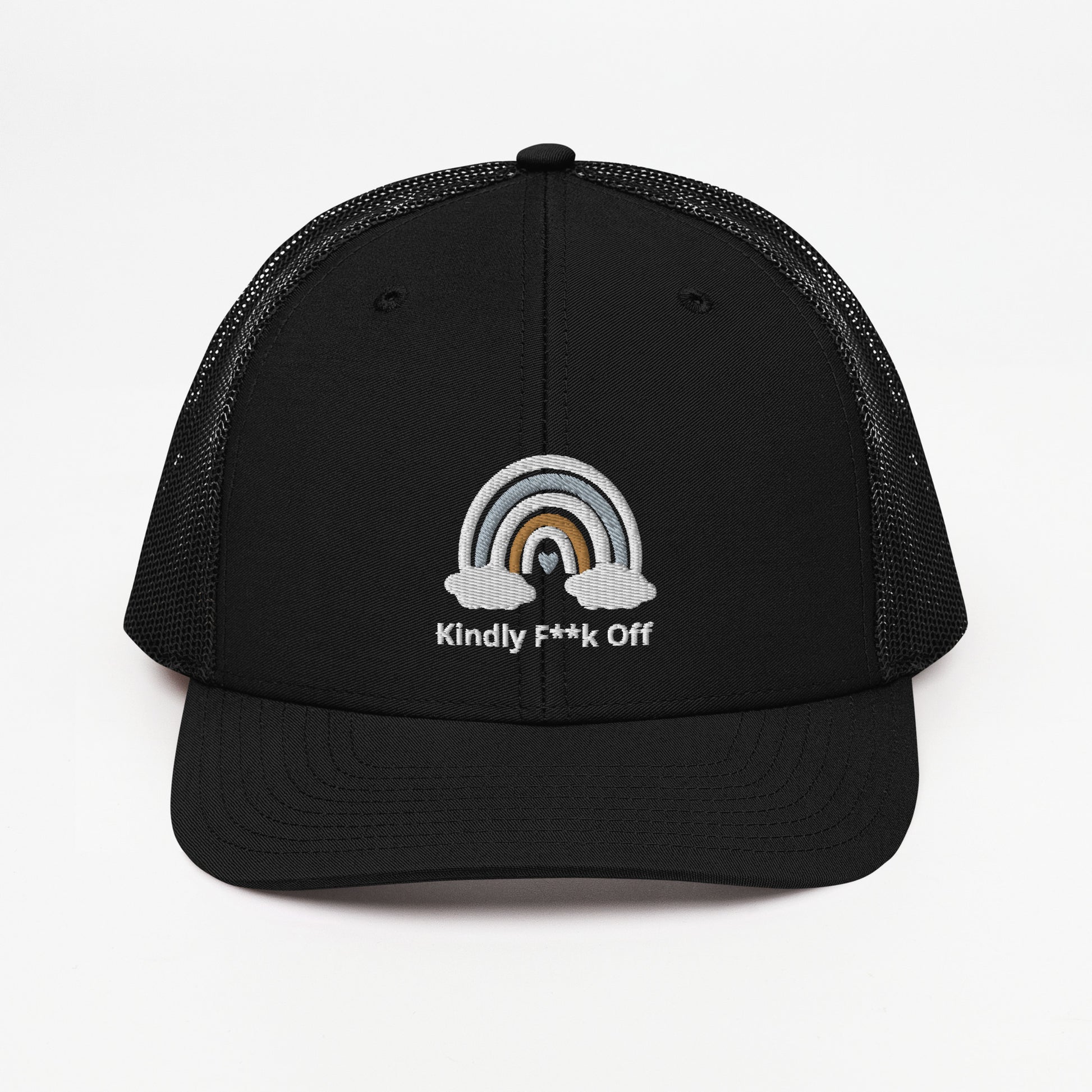 Complete your outfit with an embroidered trucker cap—combine it with a sports tee, slacks, and comfy shoes. It has a classic structured fit, adjustable plastic snapback, and a curved visor that matches its underbill. Crafted with meticulous attention to detail, this trucker hat features a rainbow design structured with a breathable mesh back.
