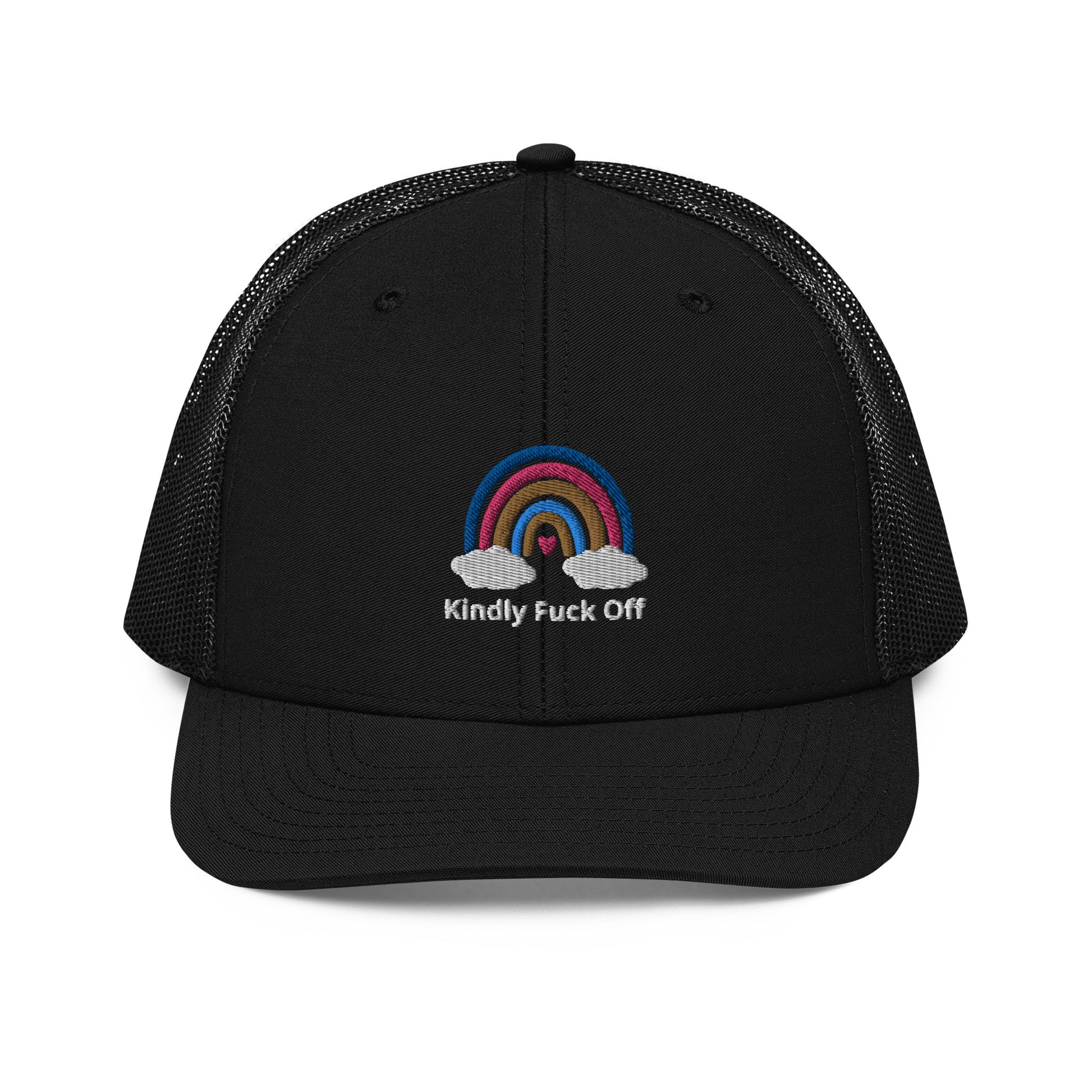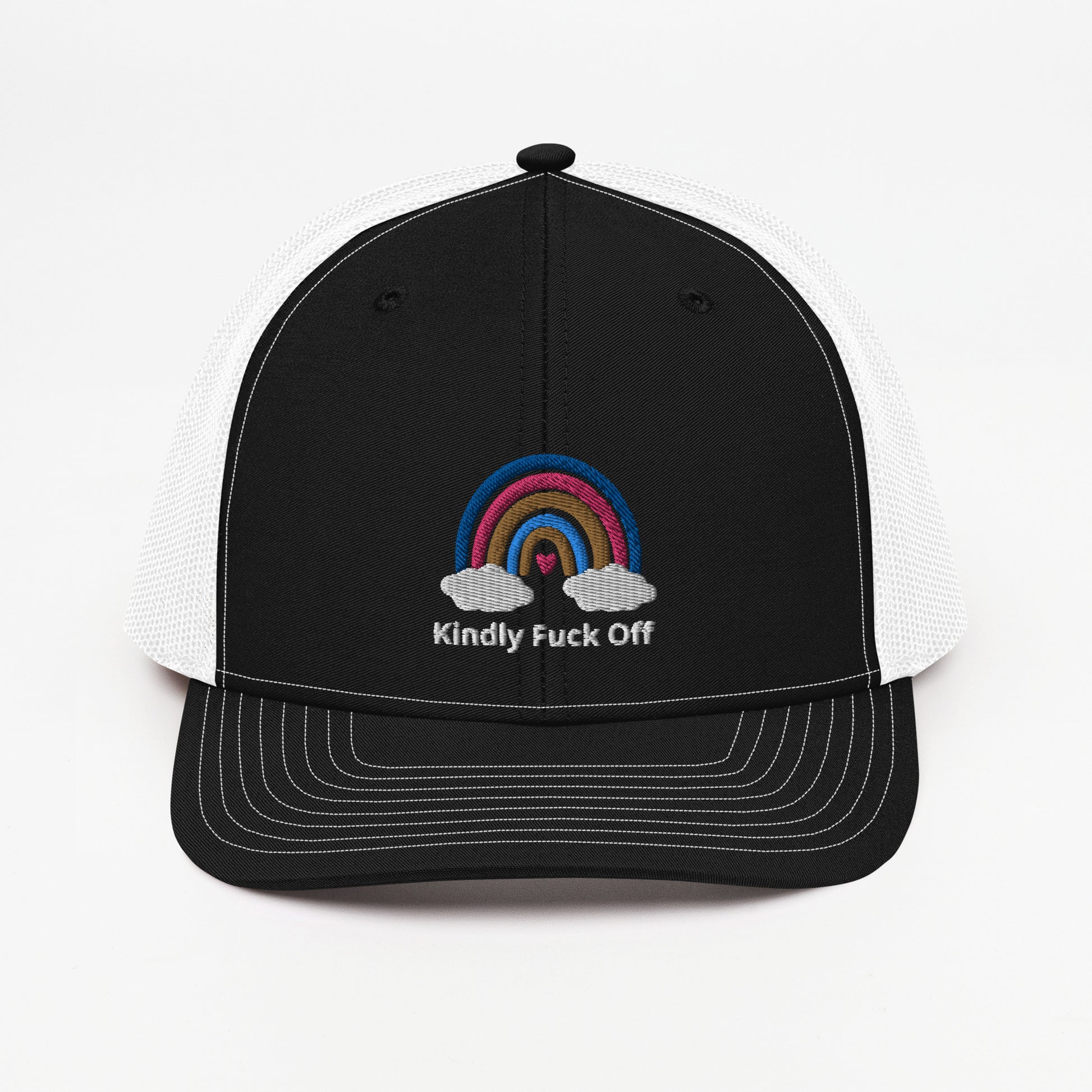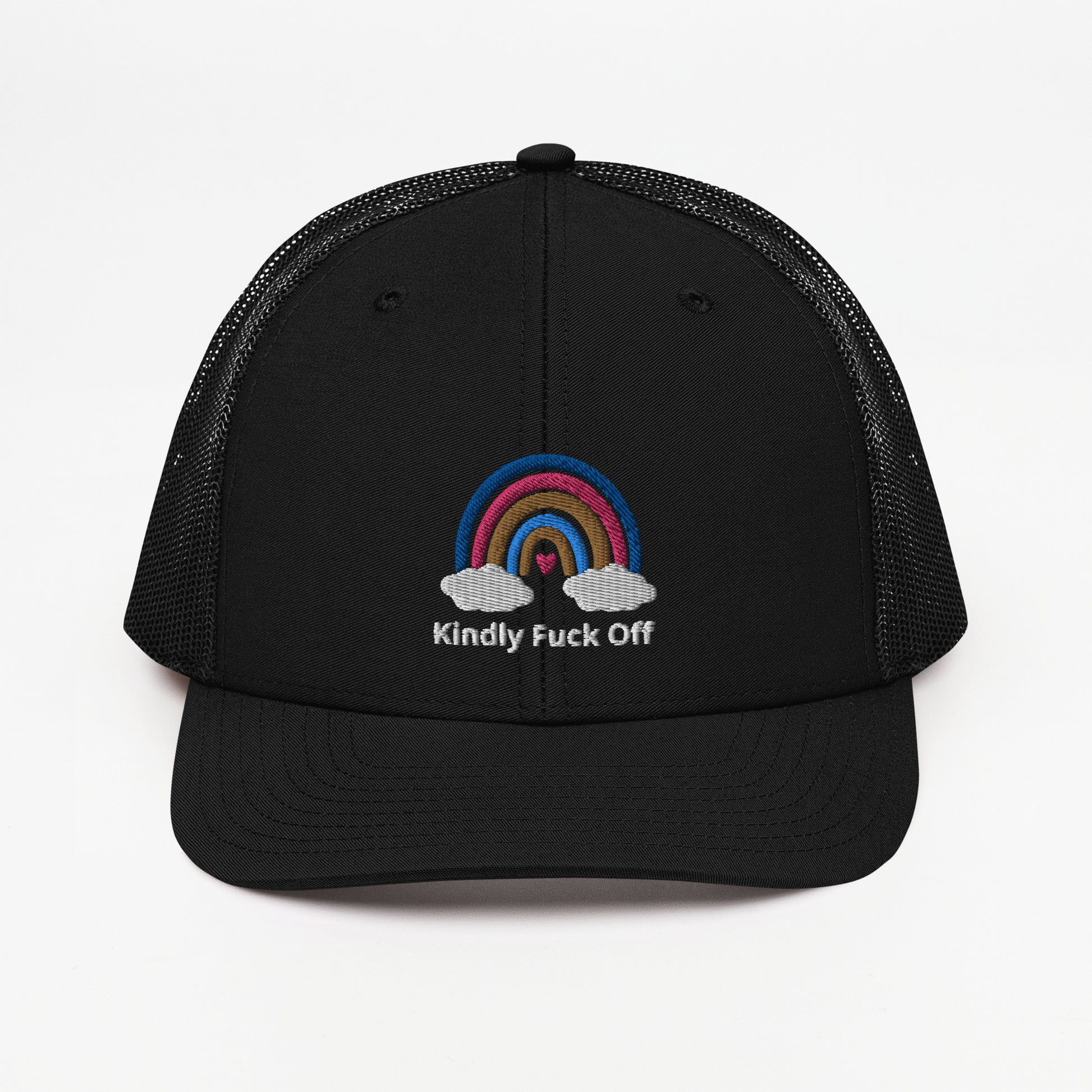 Complete your outfit with an embroidered trucker cap—combine it with a sports tee, slacks, and comfy shoes. It has a classic structured fit, adjustable plastic snapback, and a curved visor that matches its underbill. Crafted with meticulous attention to detail, this trucker hat features a rainbow design structured with a breathable mesh back.