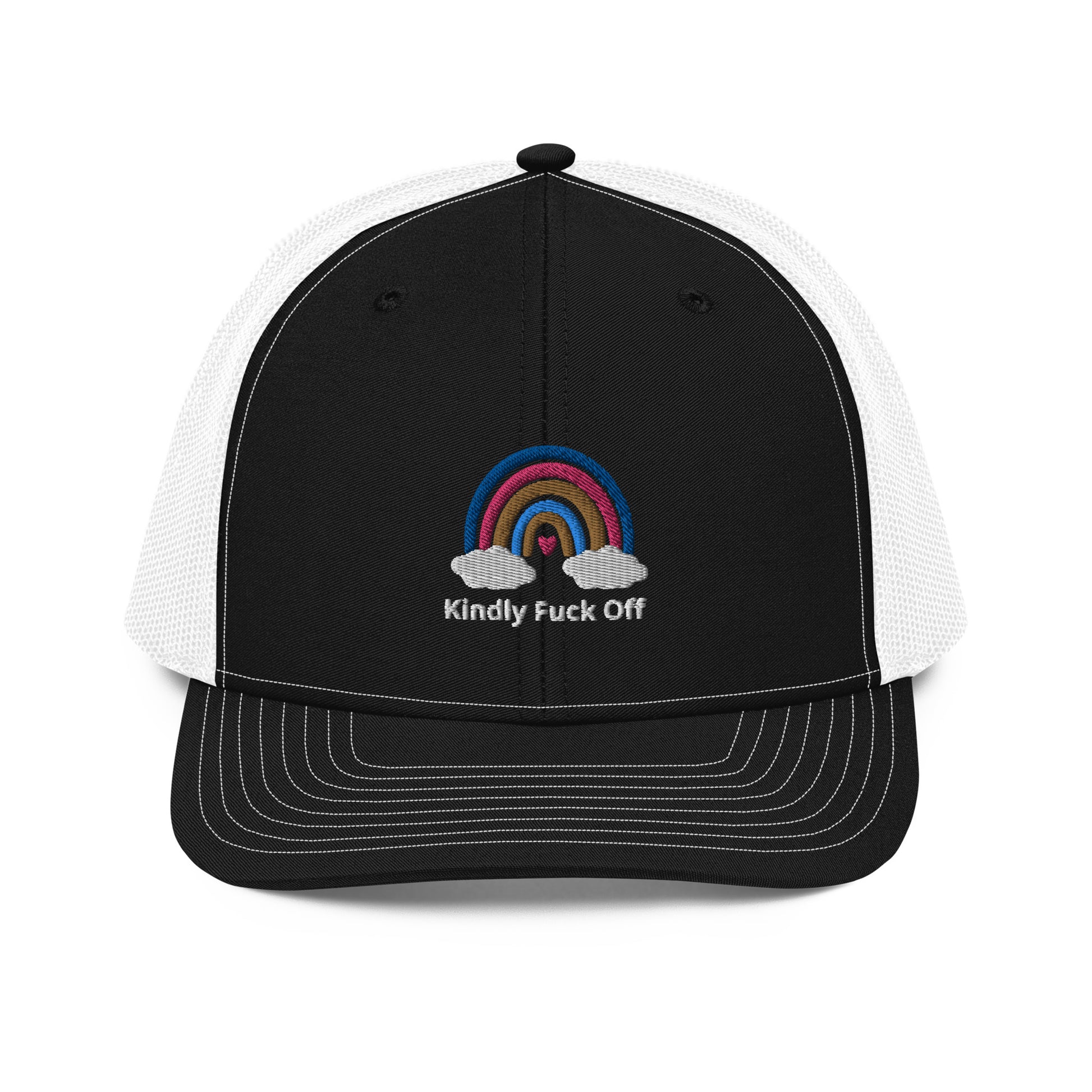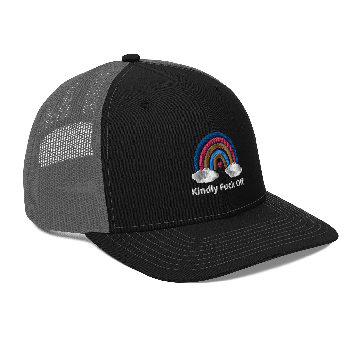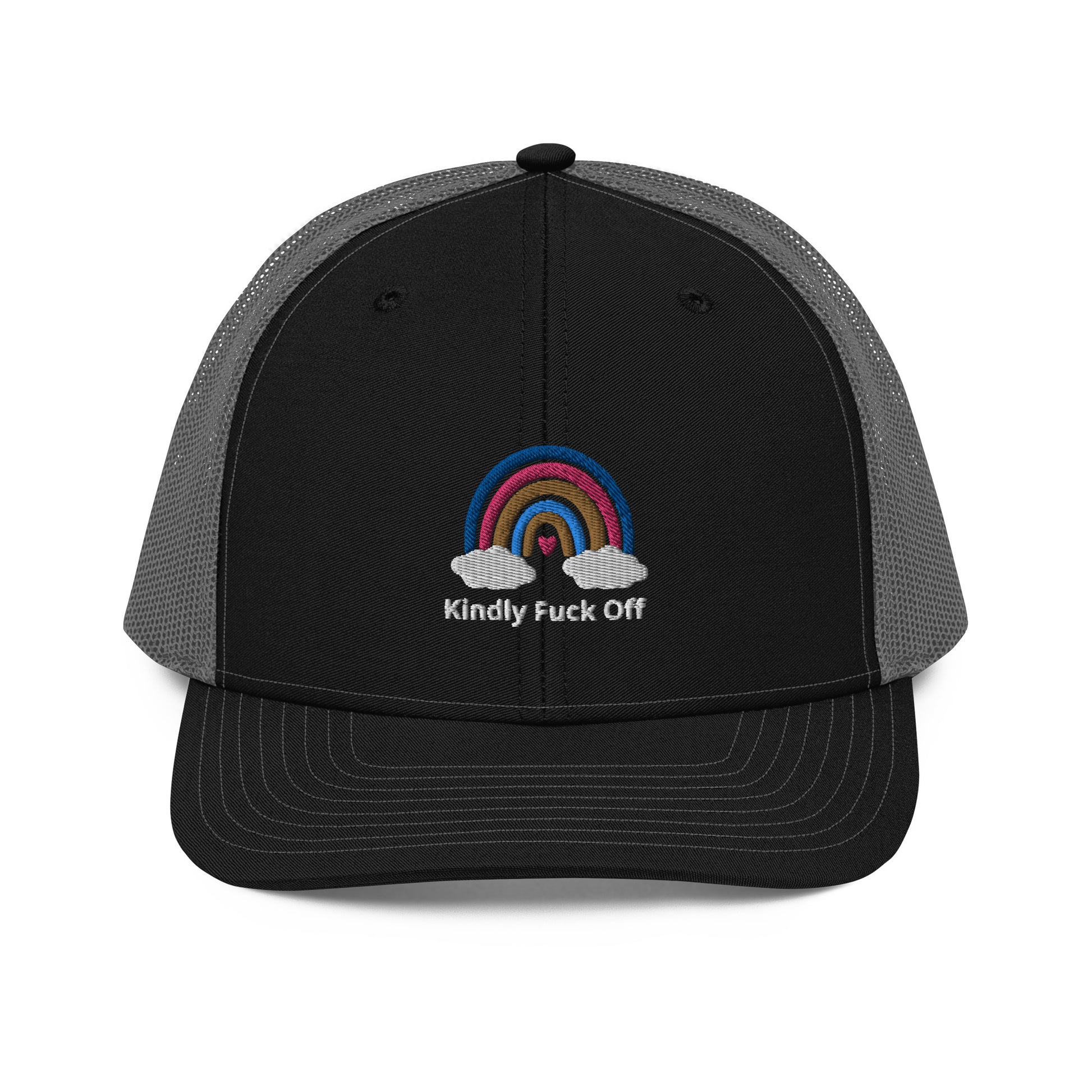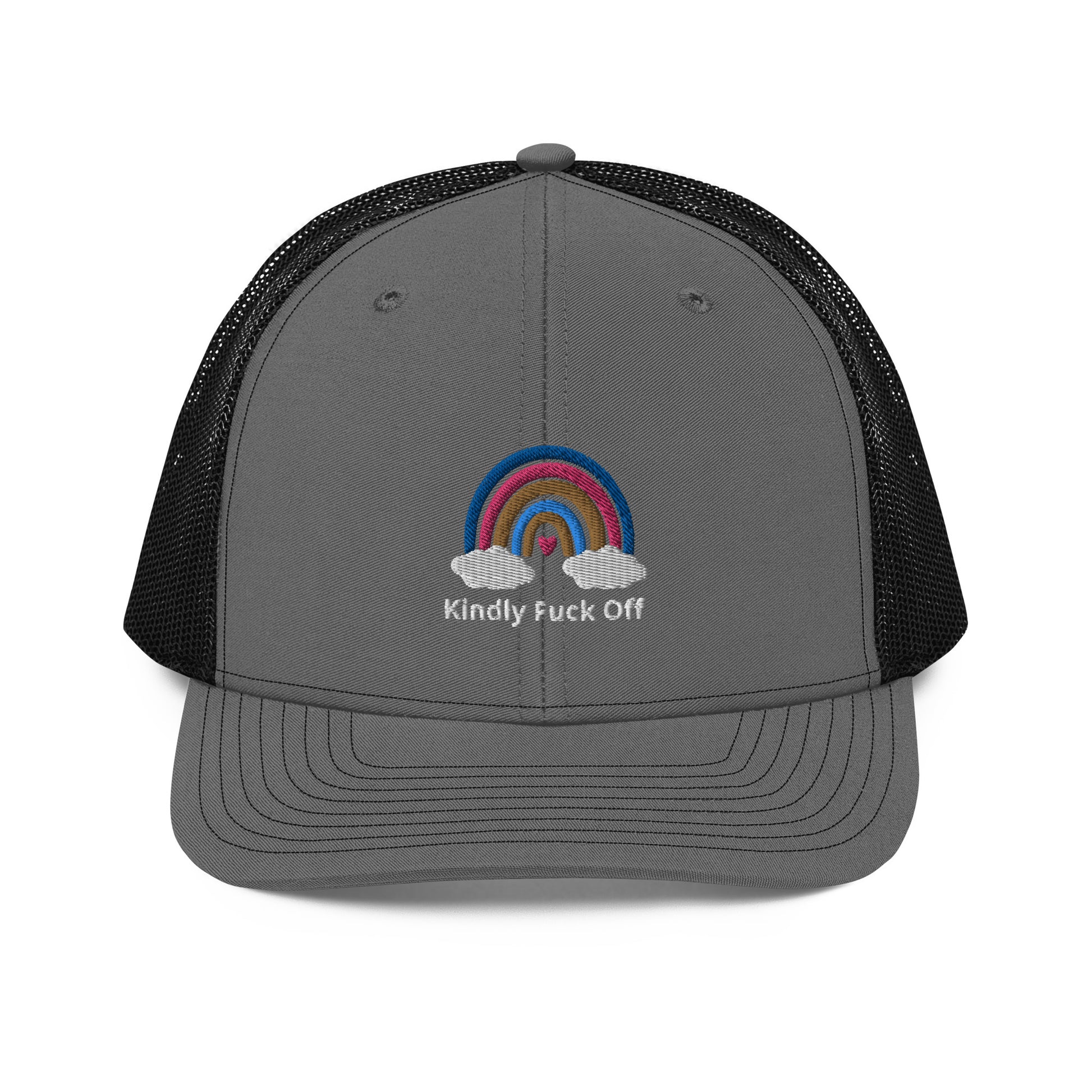 Complete your outfit with an embroidered trucker cap—combine it with a sports tee, slacks, and comfy shoes. It has a classic structured fit, adjustable plastic snapback, and a curved visor that matches its underbill. Crafted with meticulous attention to detail, this trucker hat features a rainbow design structured with a breathable mesh back.
