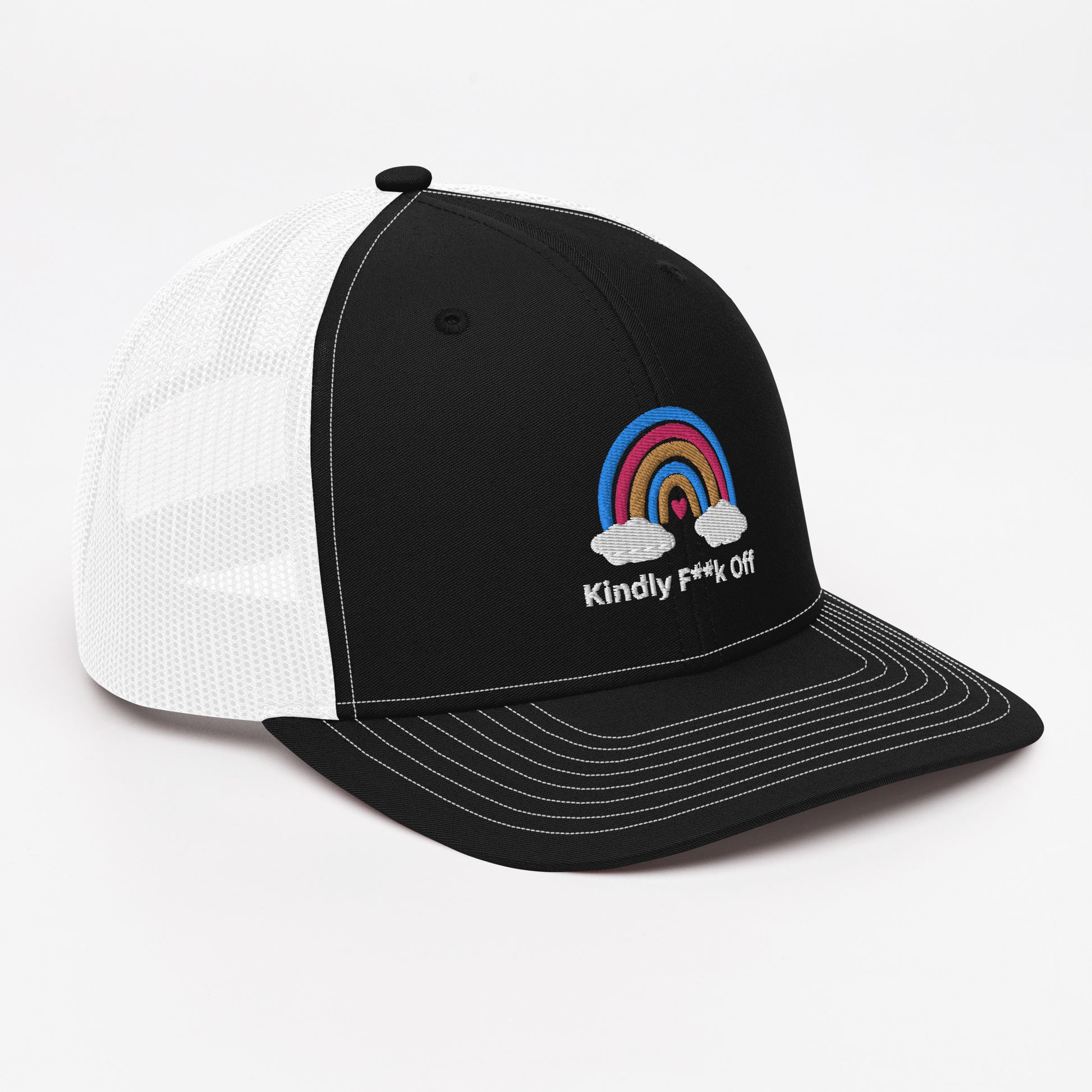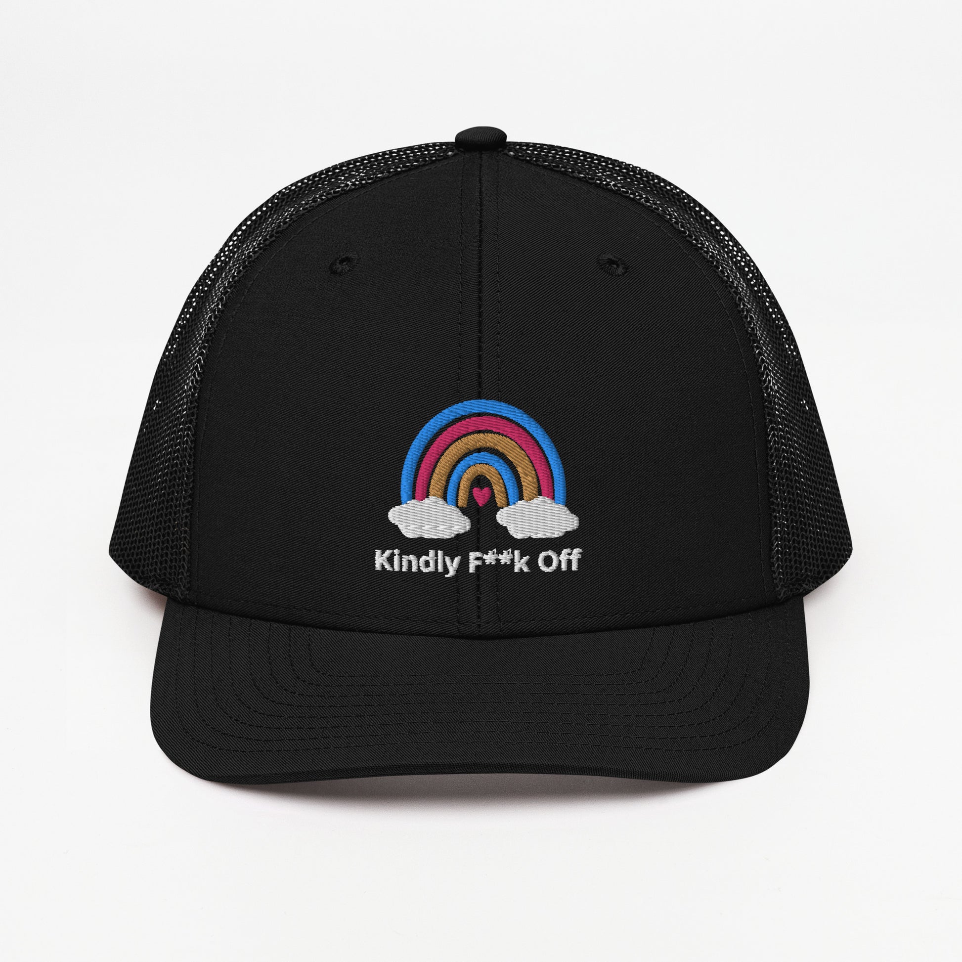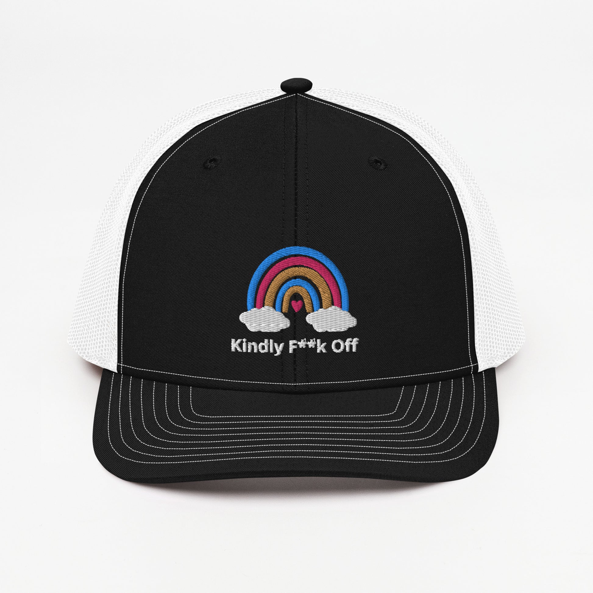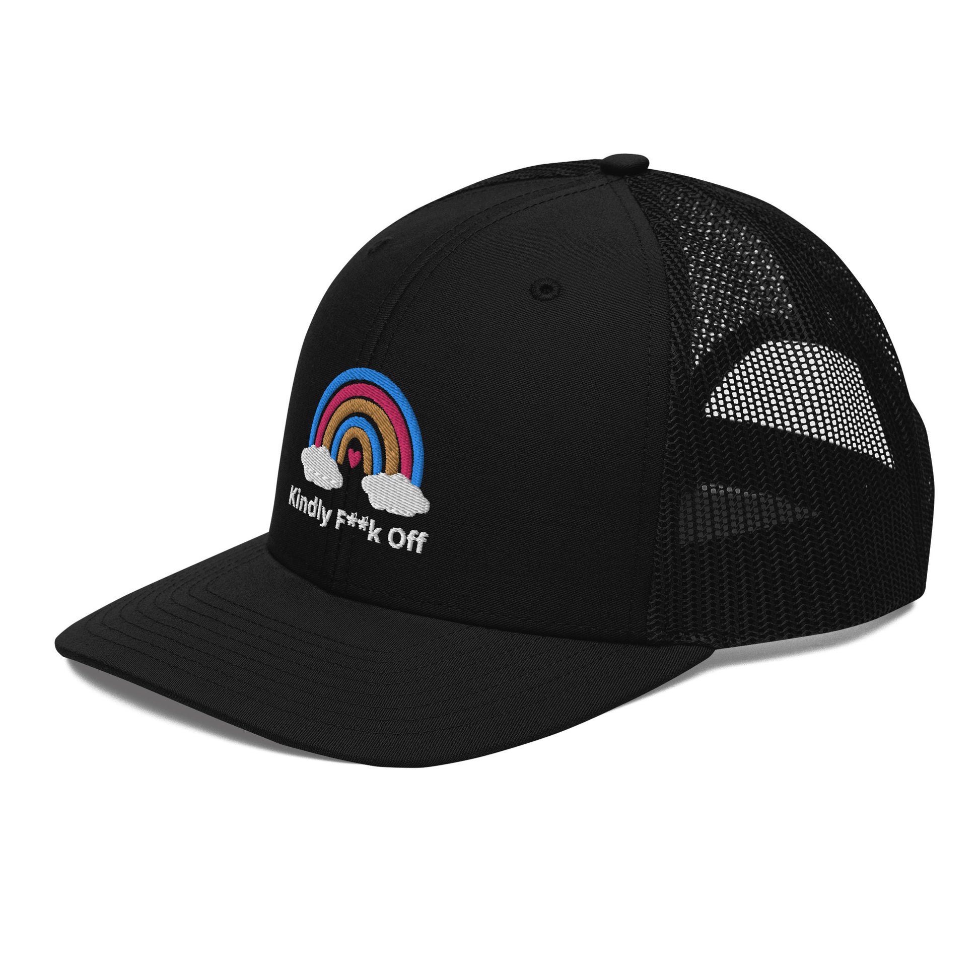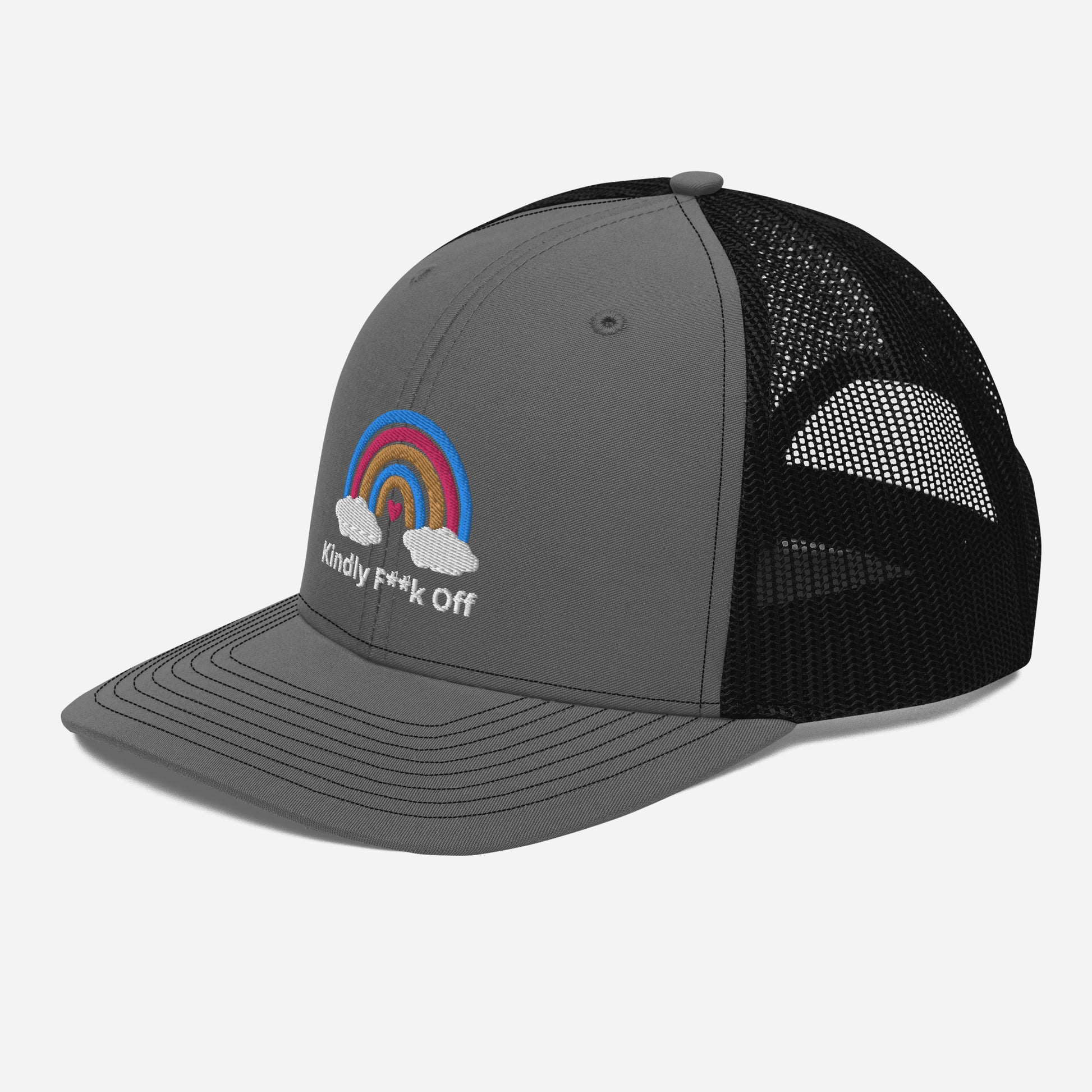 Complete your outfit with an embroidered trucker cap—combine it with a sports tee, slacks, and comfy shoes. It has a classic structured fit, adjustable plastic snapback, and a curved visor that matches its underbill. Crafted with meticulous attention to detail, this trucker hat features a rainbow design structured with a breathable mesh back.