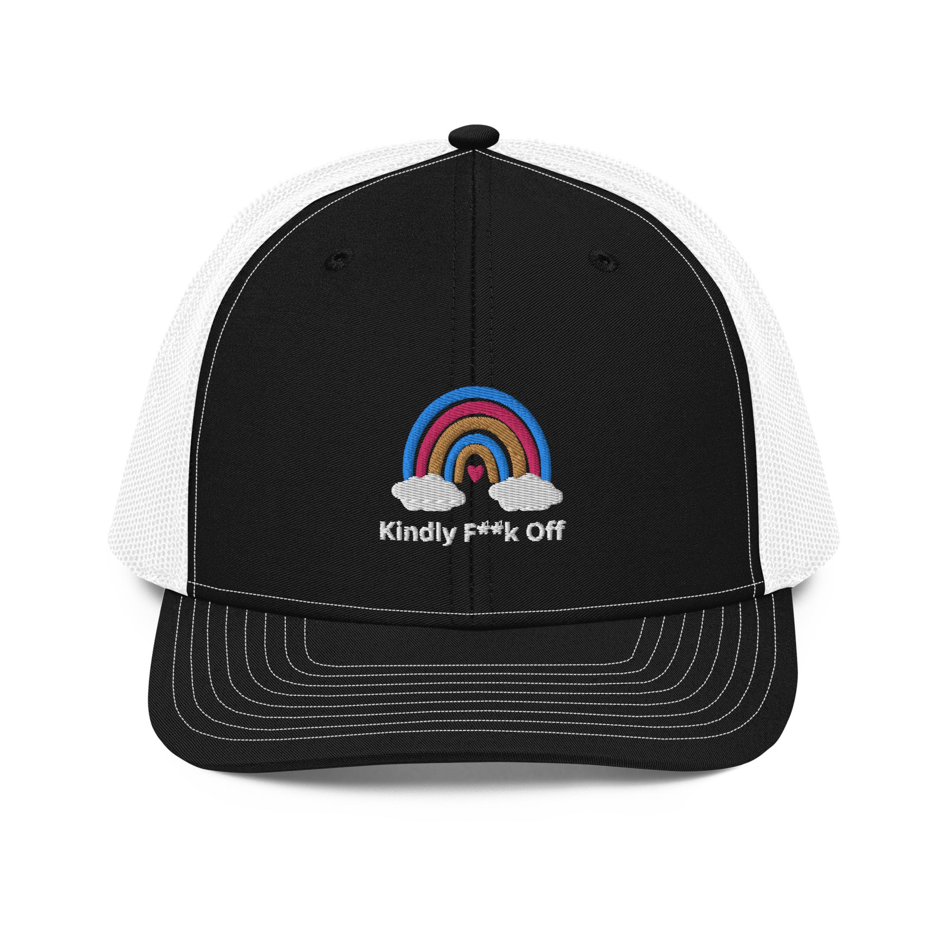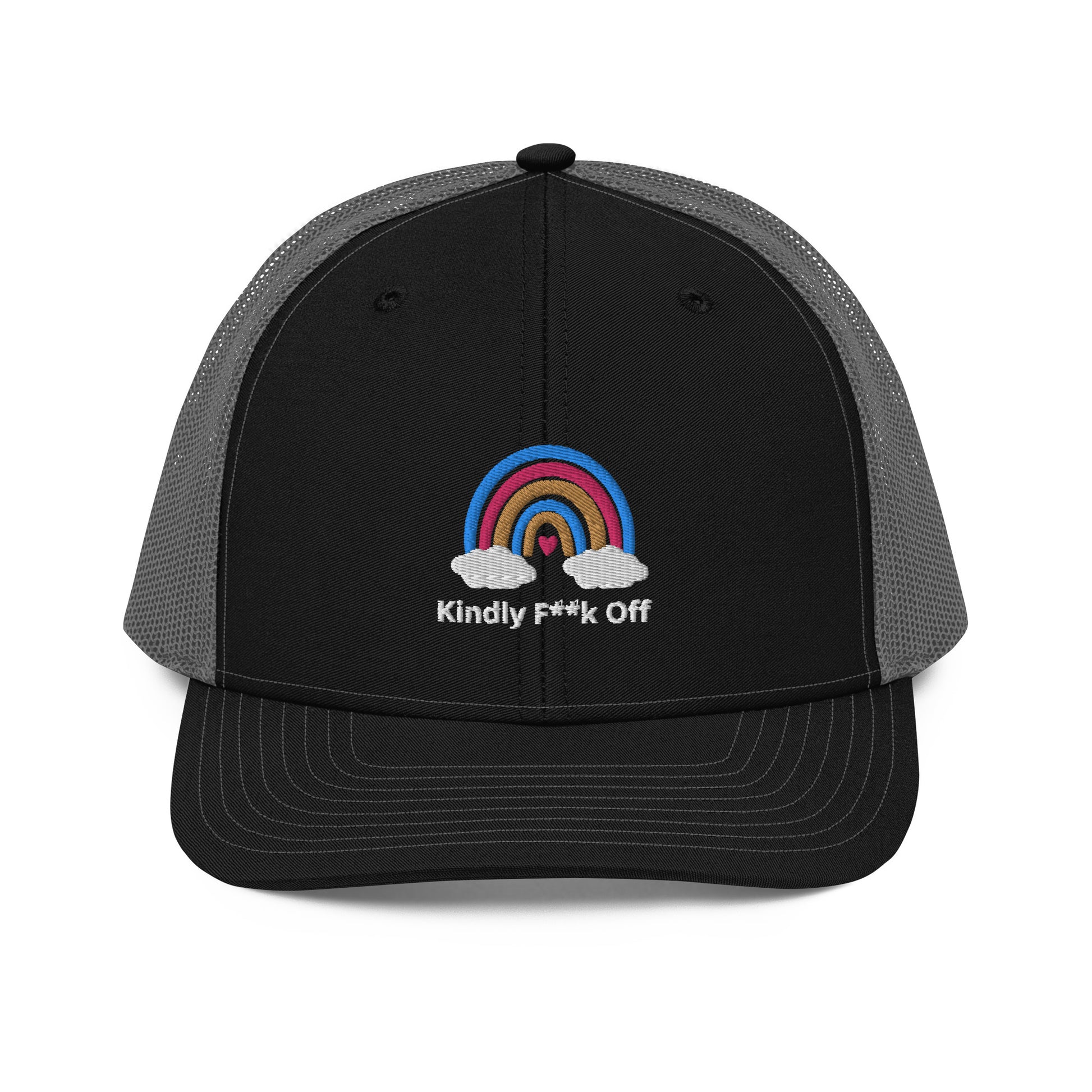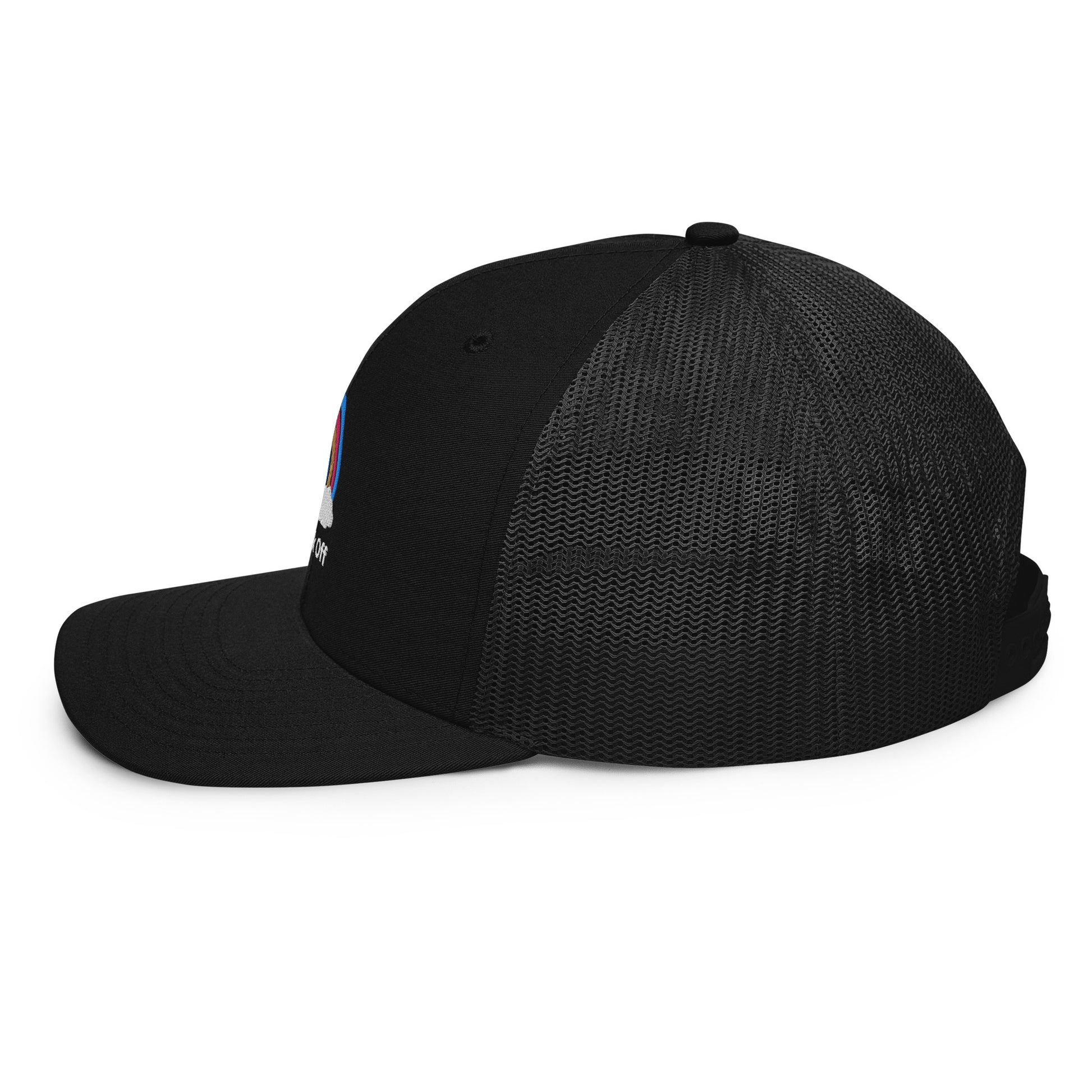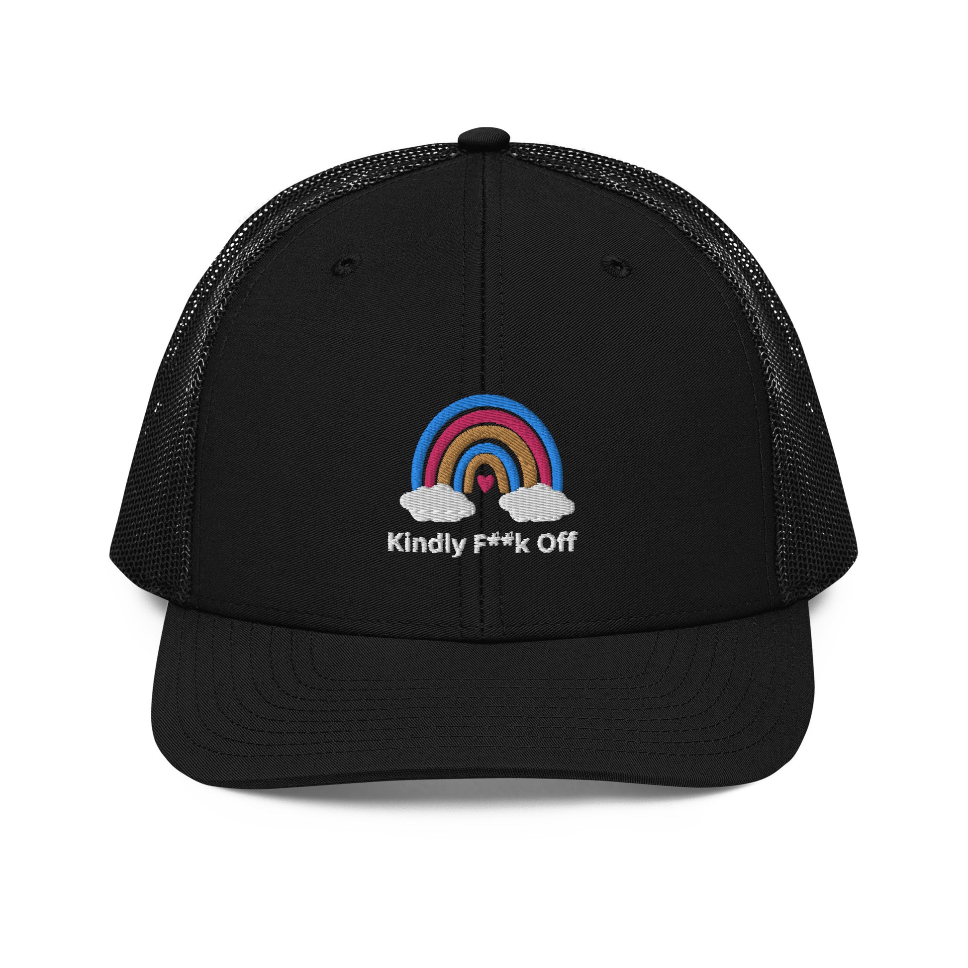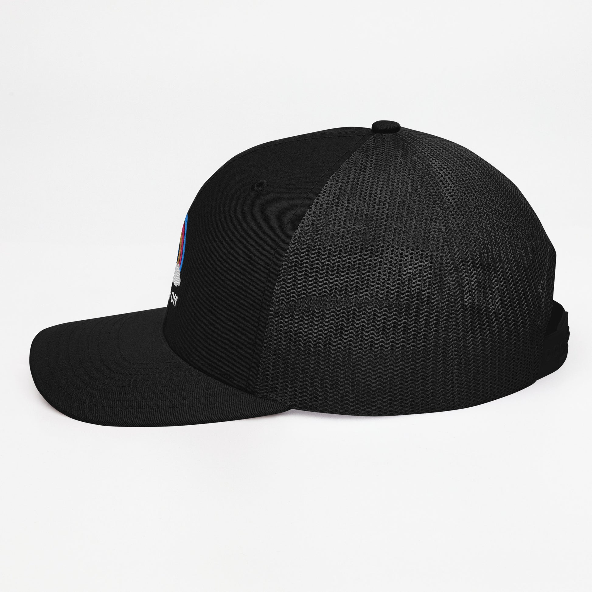 Complete your outfit with an embroidered trucker cap—combine it with a sports tee, slacks, and comfy shoes. It has a classic structured fit, adjustable plastic snapback, and a curved visor that matches its underbill. Crafted with meticulous attention to detail, this trucker hat features a rainbow design structured with a breathable mesh back.