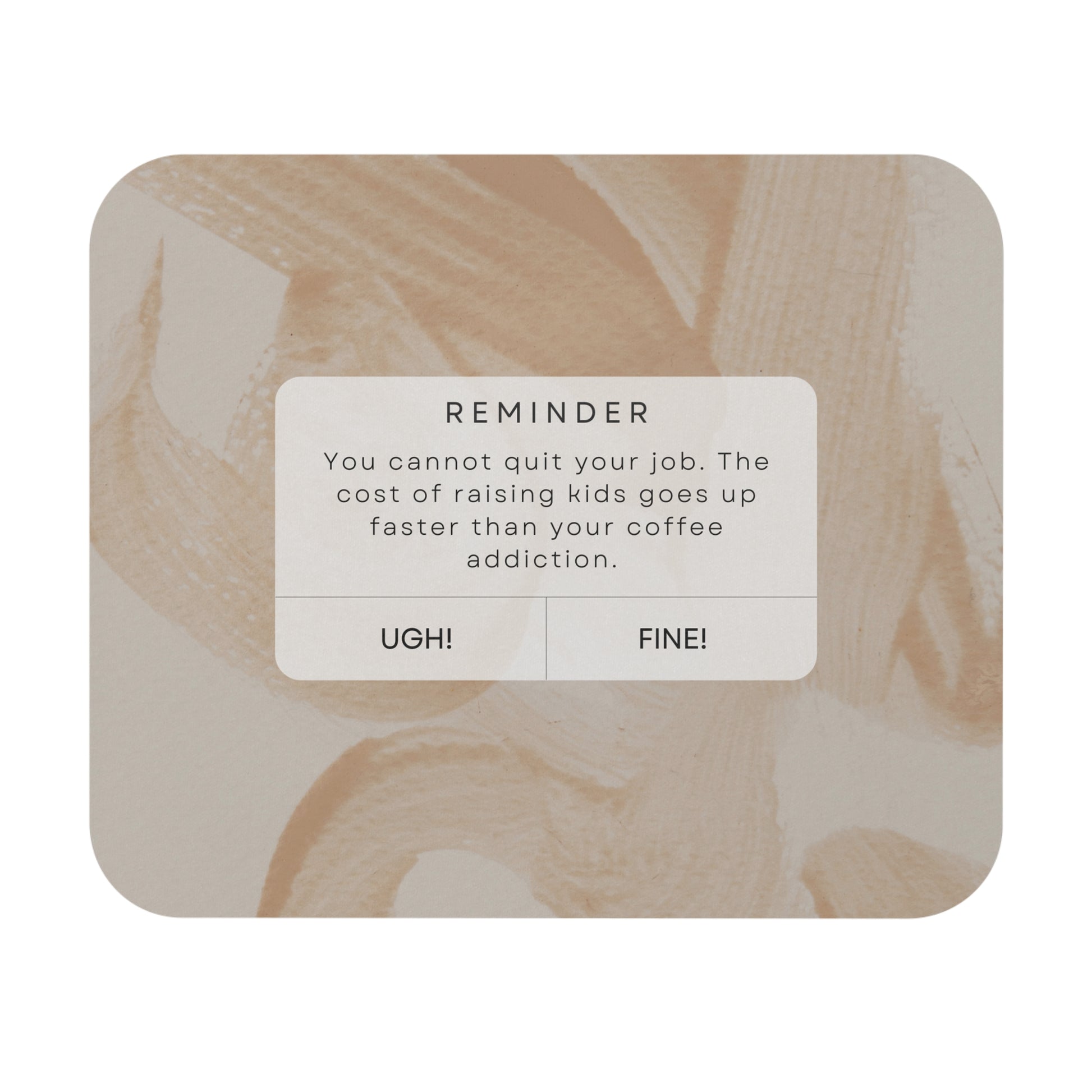 Crafted with a dash of humor and a touch of truth, this mousepad is a reminder that your little ones are growing up, and so are their needs. As you sip your coffee and click through emails, let this mousepad give you a nod and a wink – a daily dose of reality coated in humor. Thanks to the rubber base, your mouse pad has a firm grip on the desk and stain-resistant cloth top.