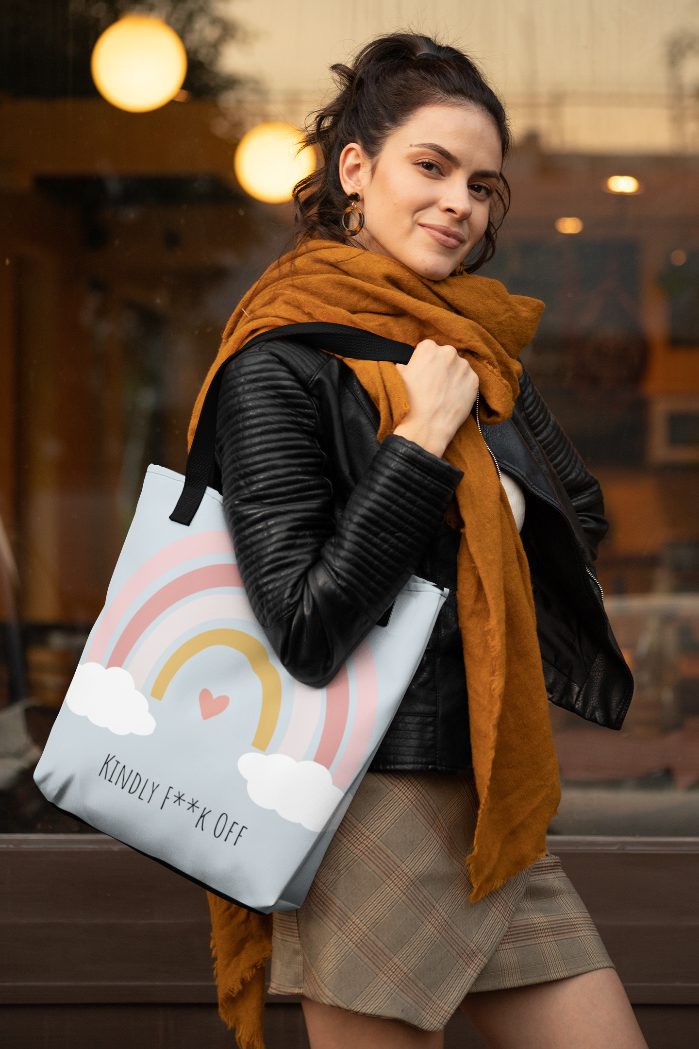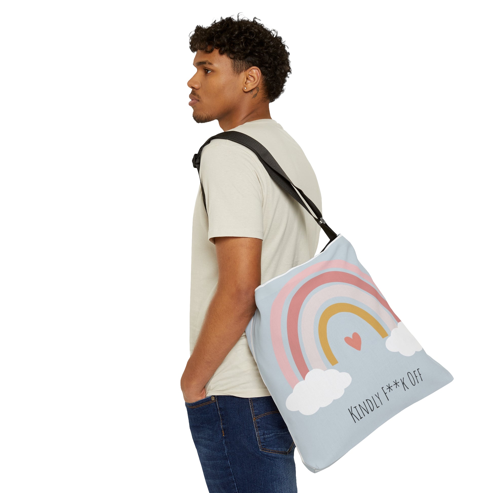 The F**K Off Rainbow Adjustable Tote, a bold and vibrant accessory that combines a playful attitude with colorful style. This eye-catching tote features a captivating rainbow design along with the assertive phrase "Kindly F**k Off," making it a perfect statement piece for those who embrace their individuality and aren't afraid to express their boundaries.