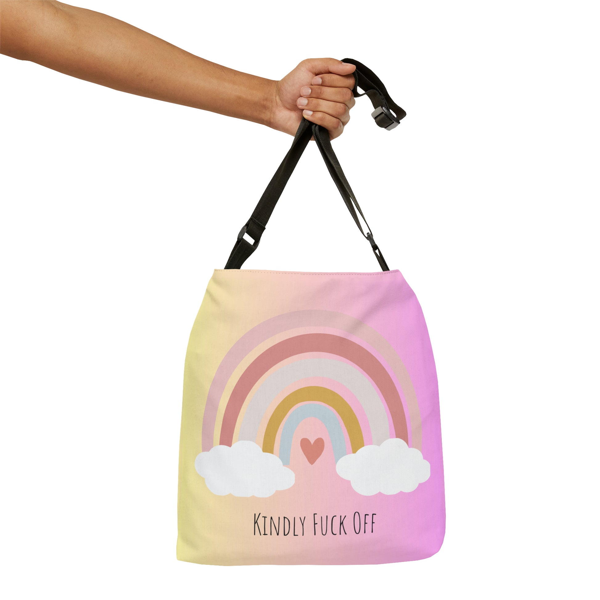 The F**K Off Rainbow Adjustable Tote, a bold and vibrant accessory that combines a playful attitude with colorful style.