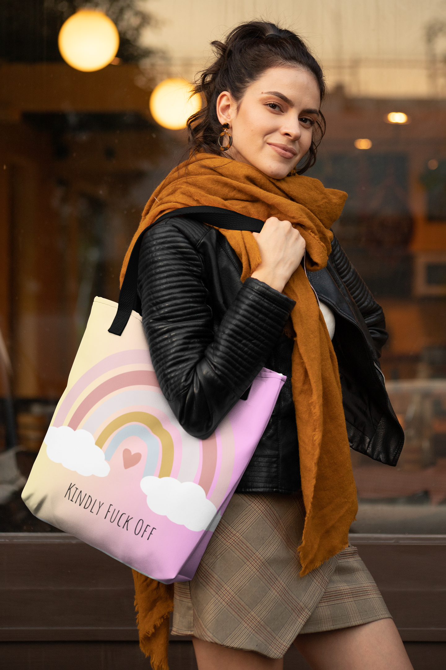 Our Kindly F**k Off Rainbow Adjustable Tote serves as a fashion-forward accessory. Embrace your uniqueness and let your tote do the talking, as you make a statement wherever you go.